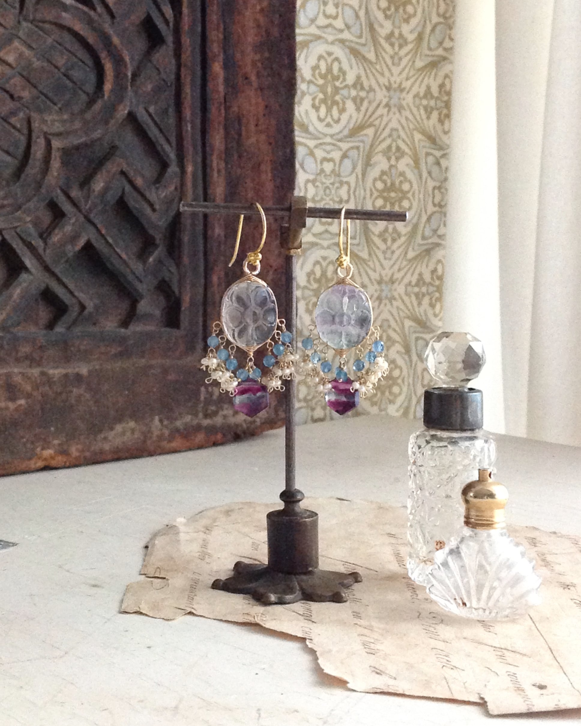 少しパープルの入った美しいフローライトのカービング。間のアクアマリンと、先端のフローライトの色合いもポイントです。