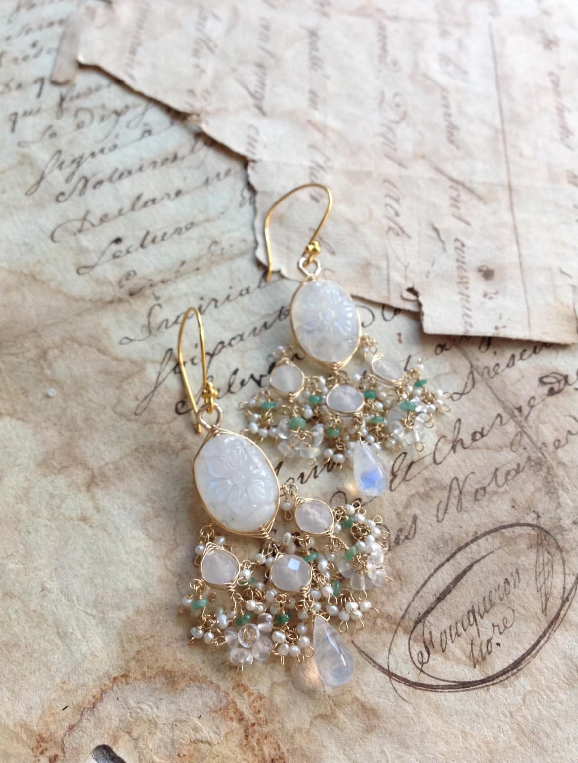 素材:ワイヤー14kgf、ピアスフック24kgp、淡水パール、エメラルド、アンデシンラブラドライト、ブルームーンストーン