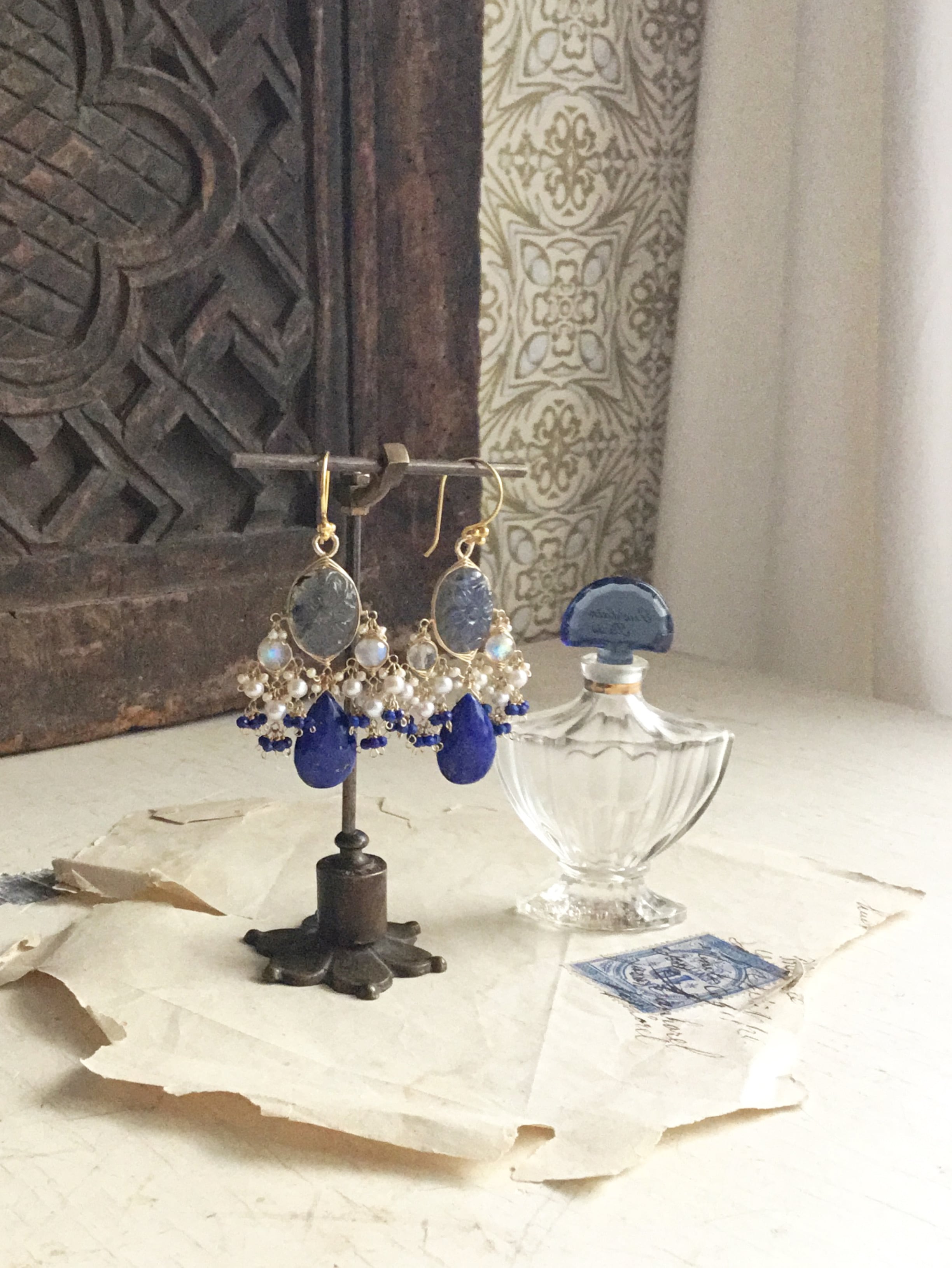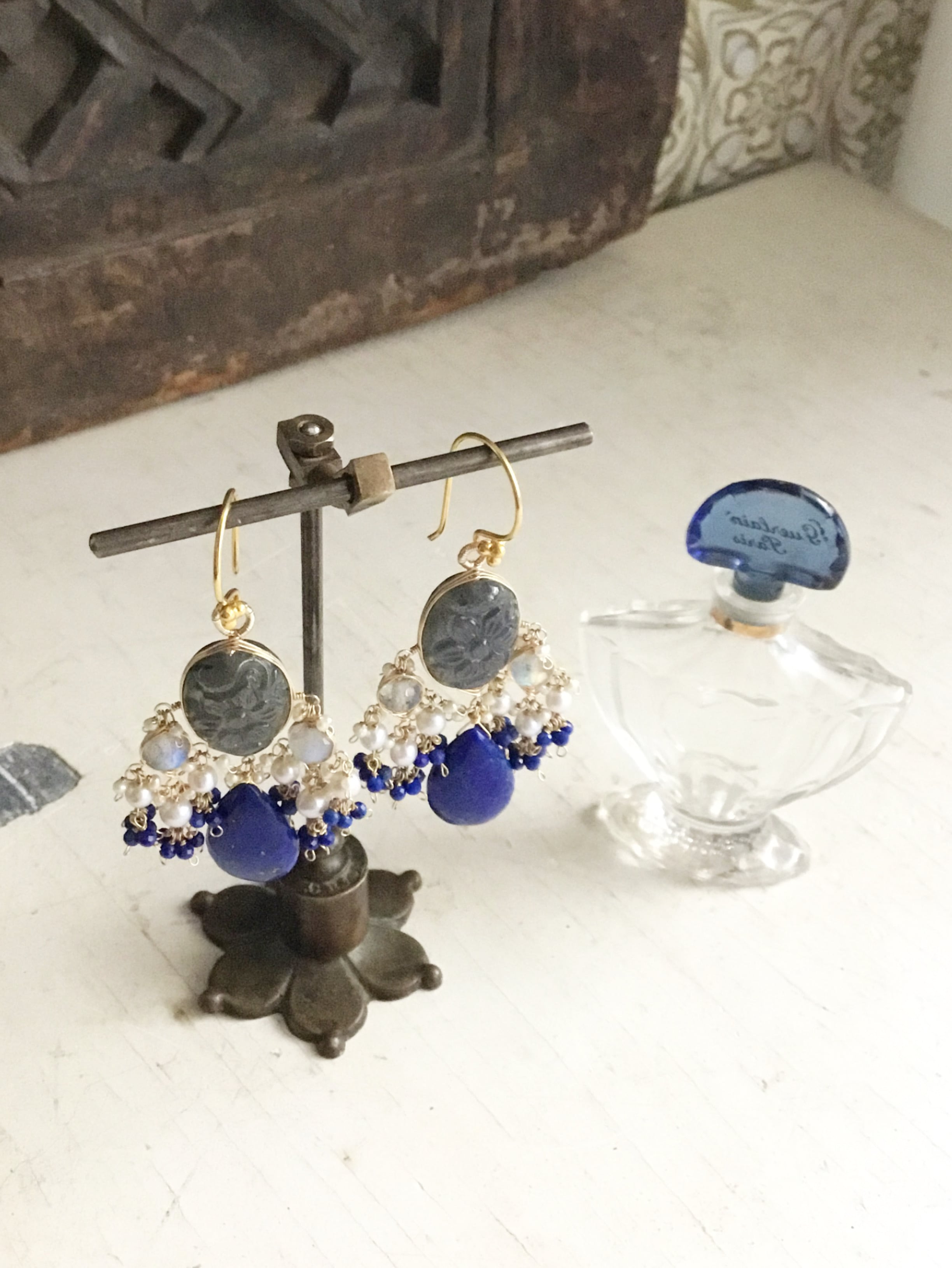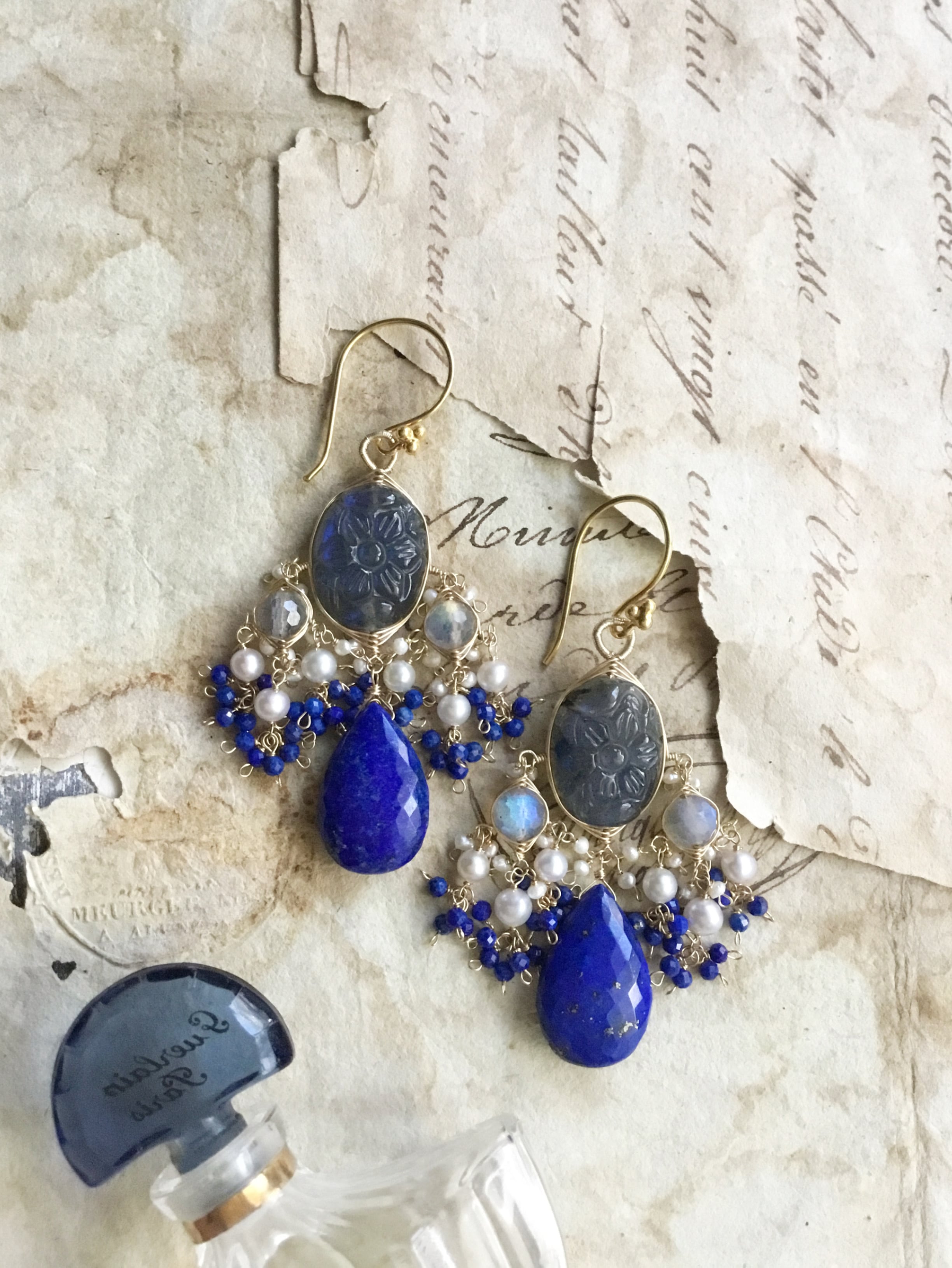 美しいシラーを持つラブラドライトのカービングと、大粒のラピスラズリを使用しています。