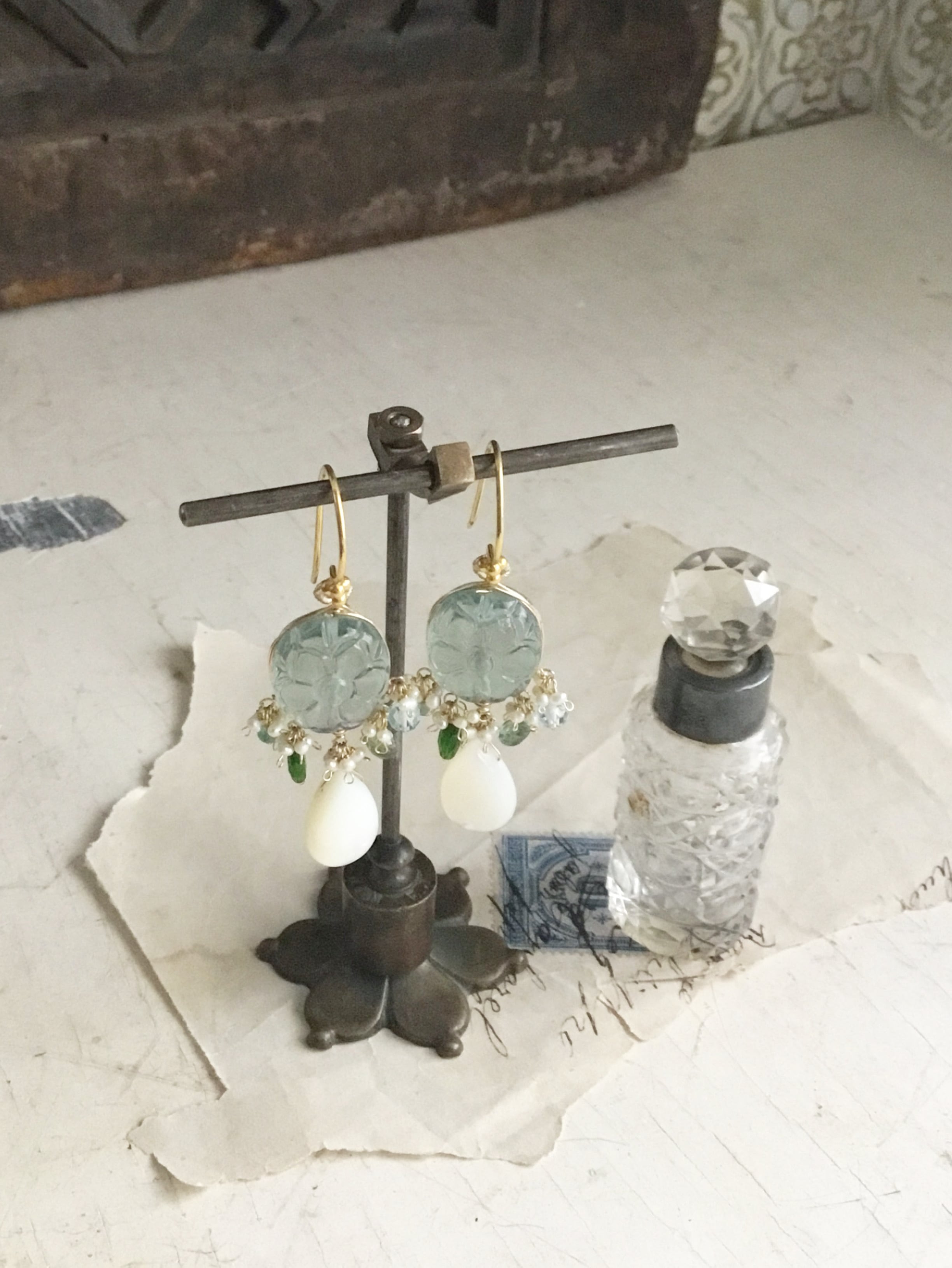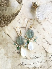 素材:ワイヤー14kgf、ピアスフック24kgp、淡水パール、フローライト、MOP(白蝶貝)、カイヤナイト、クロムダイオプサイド、エメラルド、トパーズ