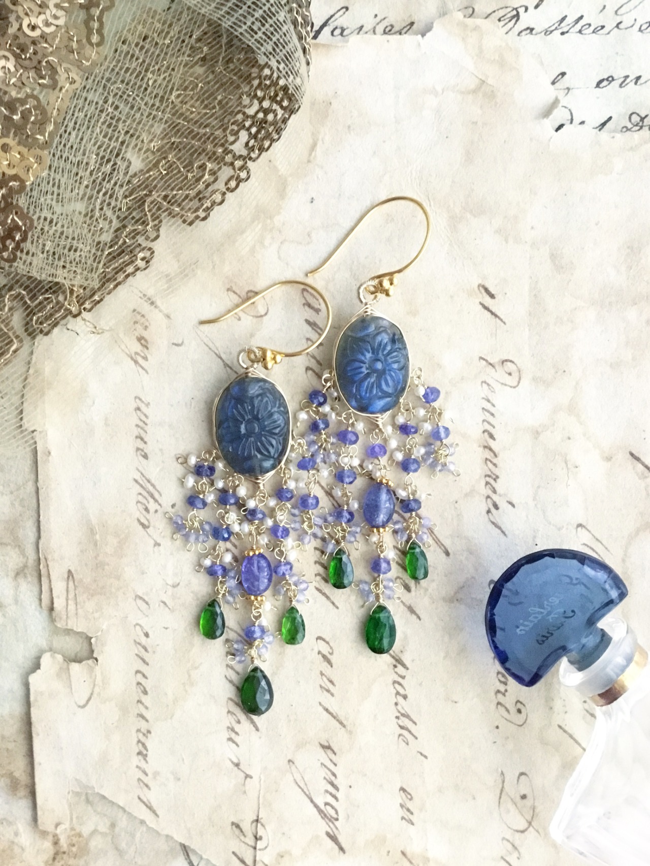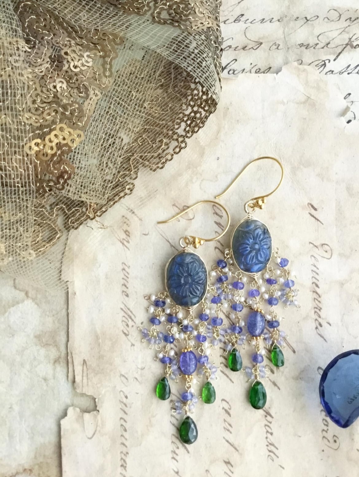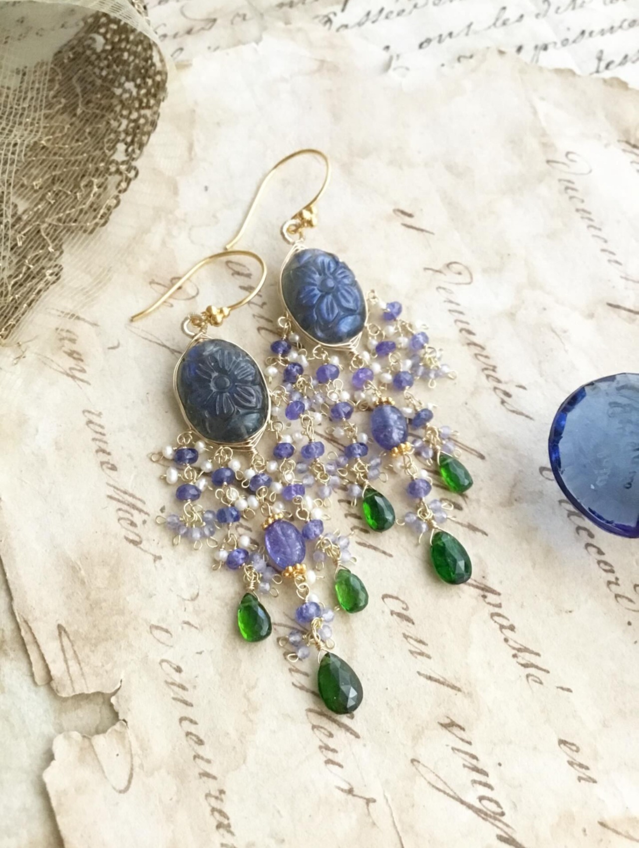ラブラドライトカービングに、タンザナイトと鮮やかなグリーンが美しいクロムダイオプサイドを合わせています。