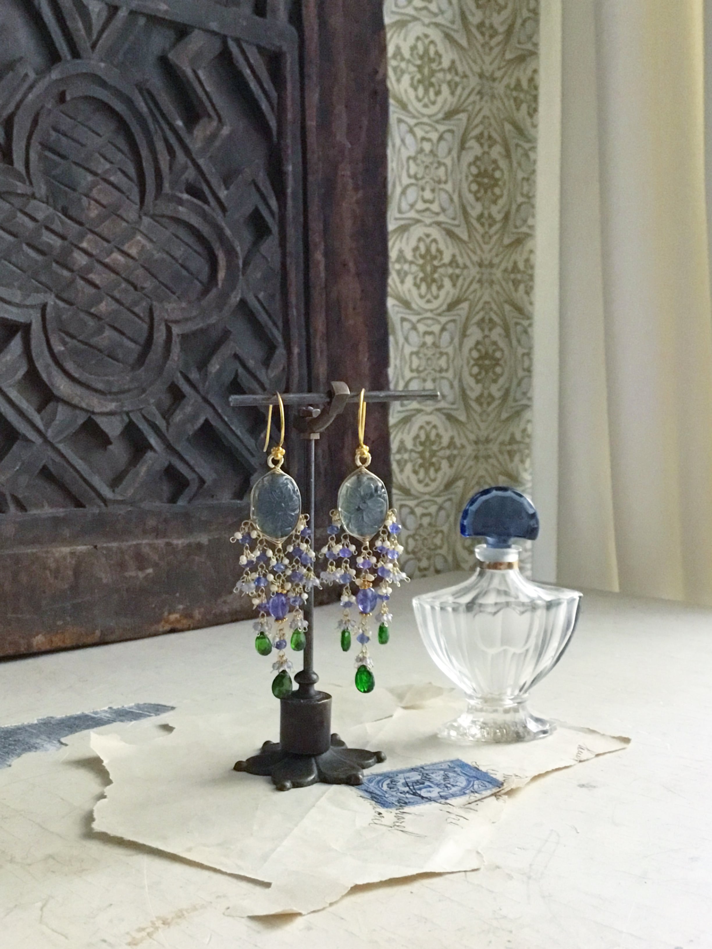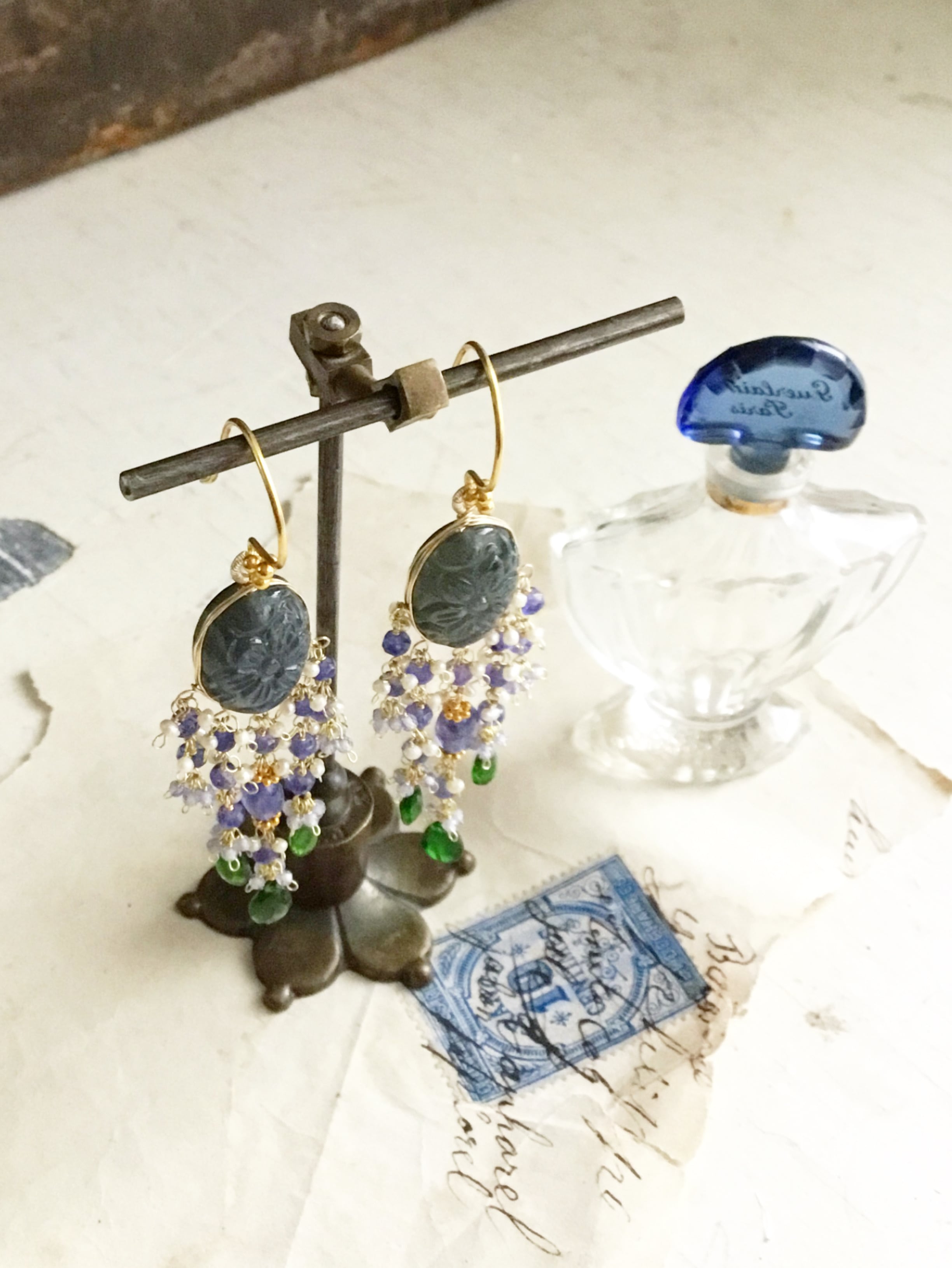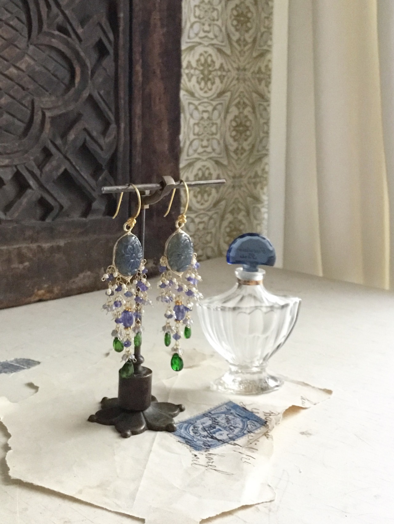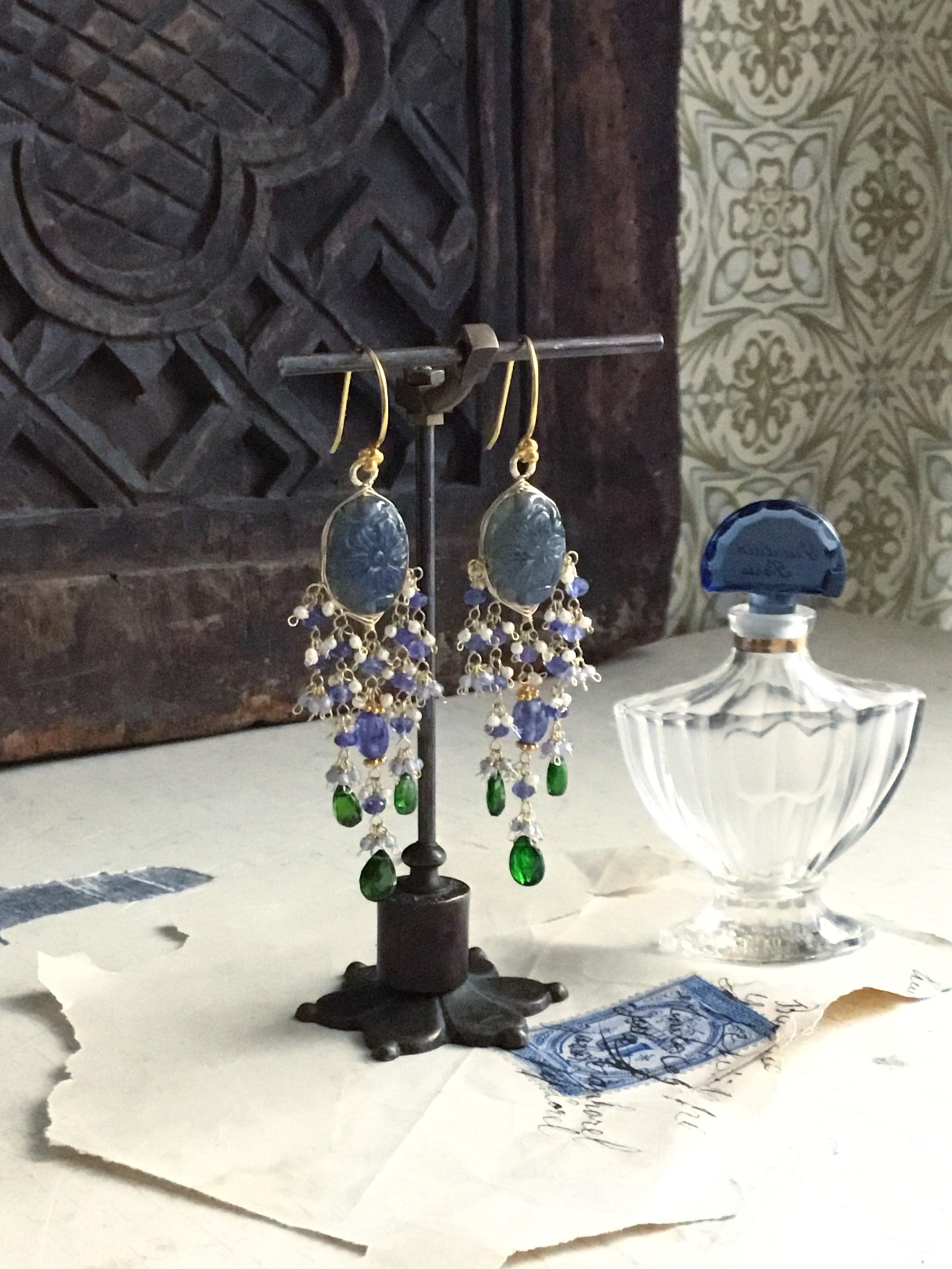 ラブラドライトカービングに、タンザナイトと鮮やかなグリーンが美しいクロムダイオプサイドを合わせています。