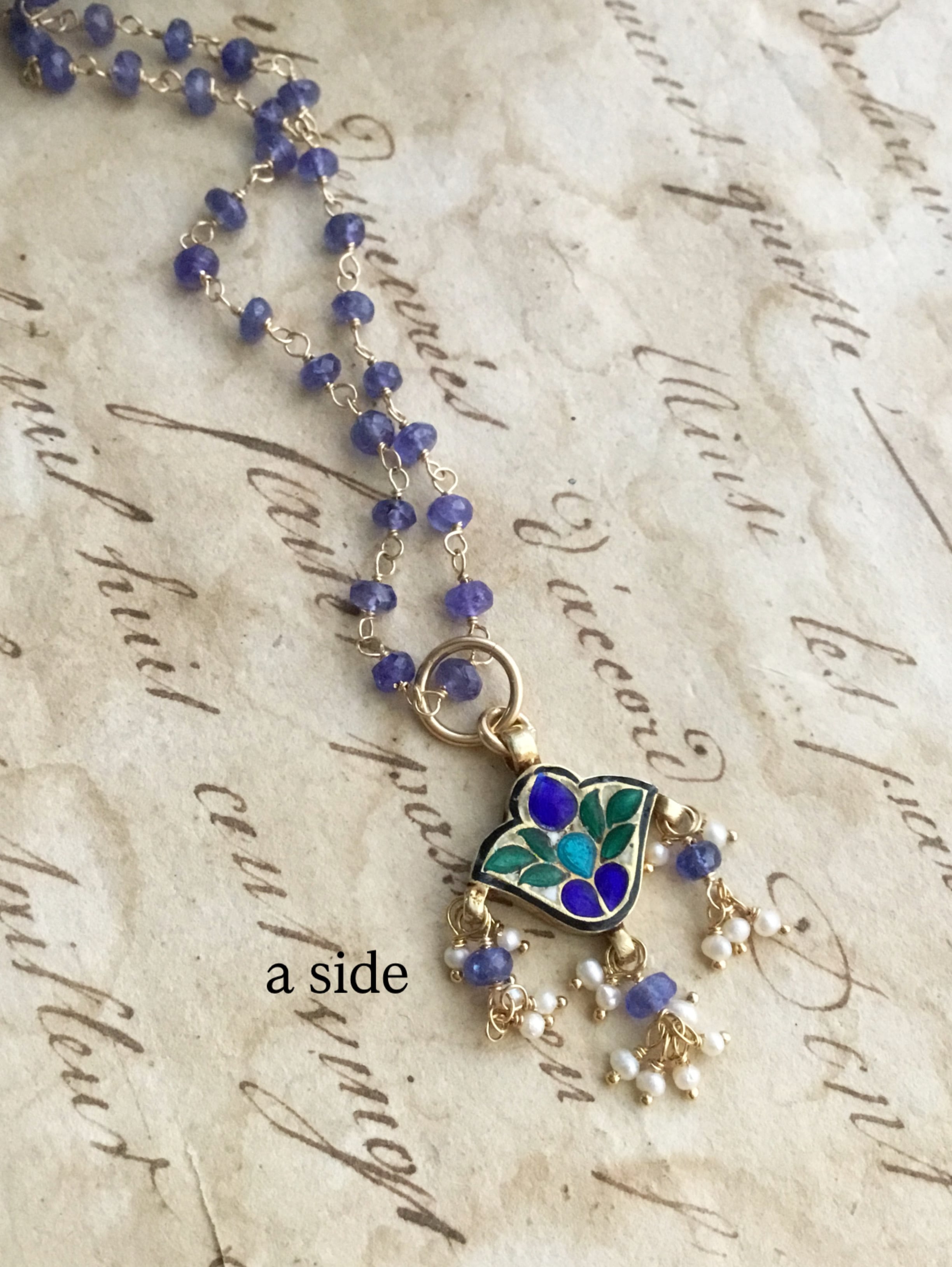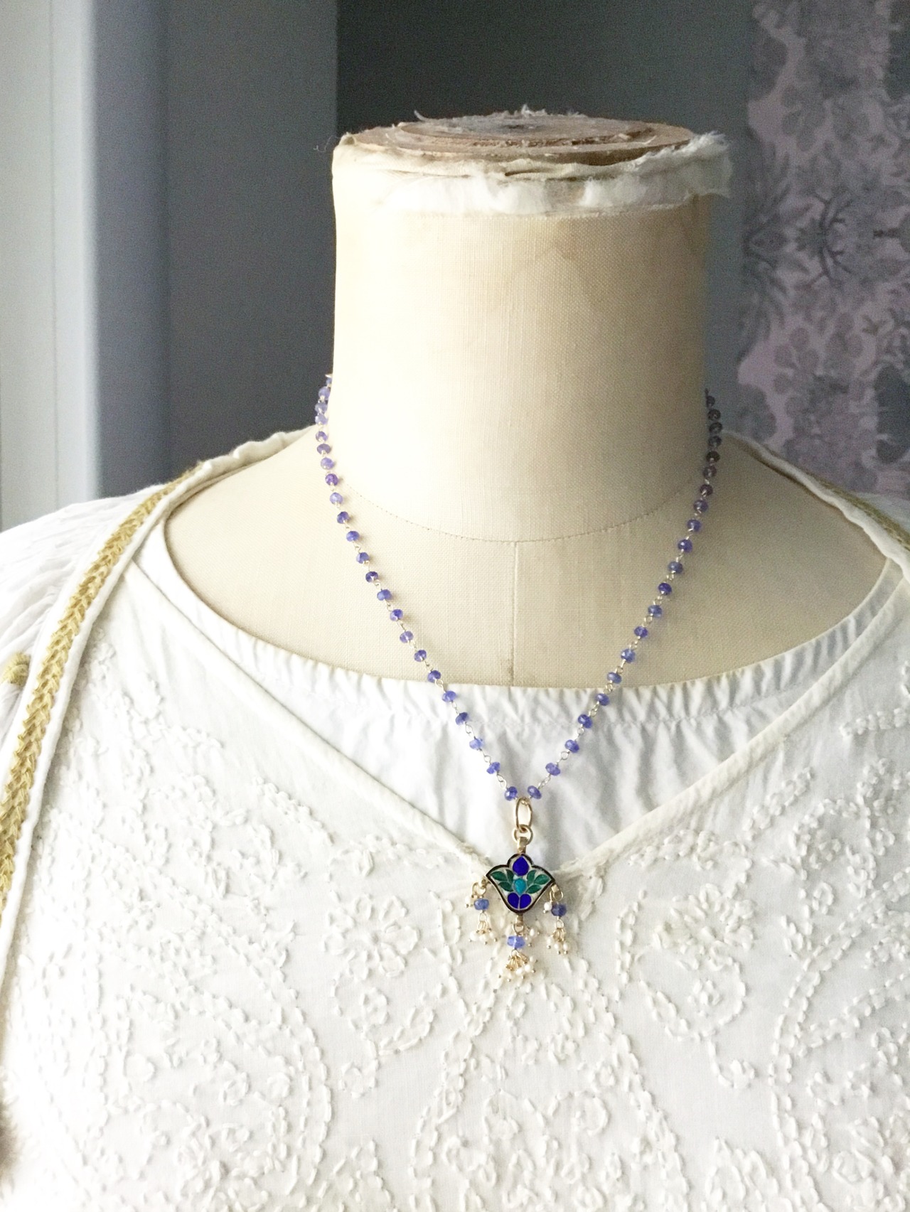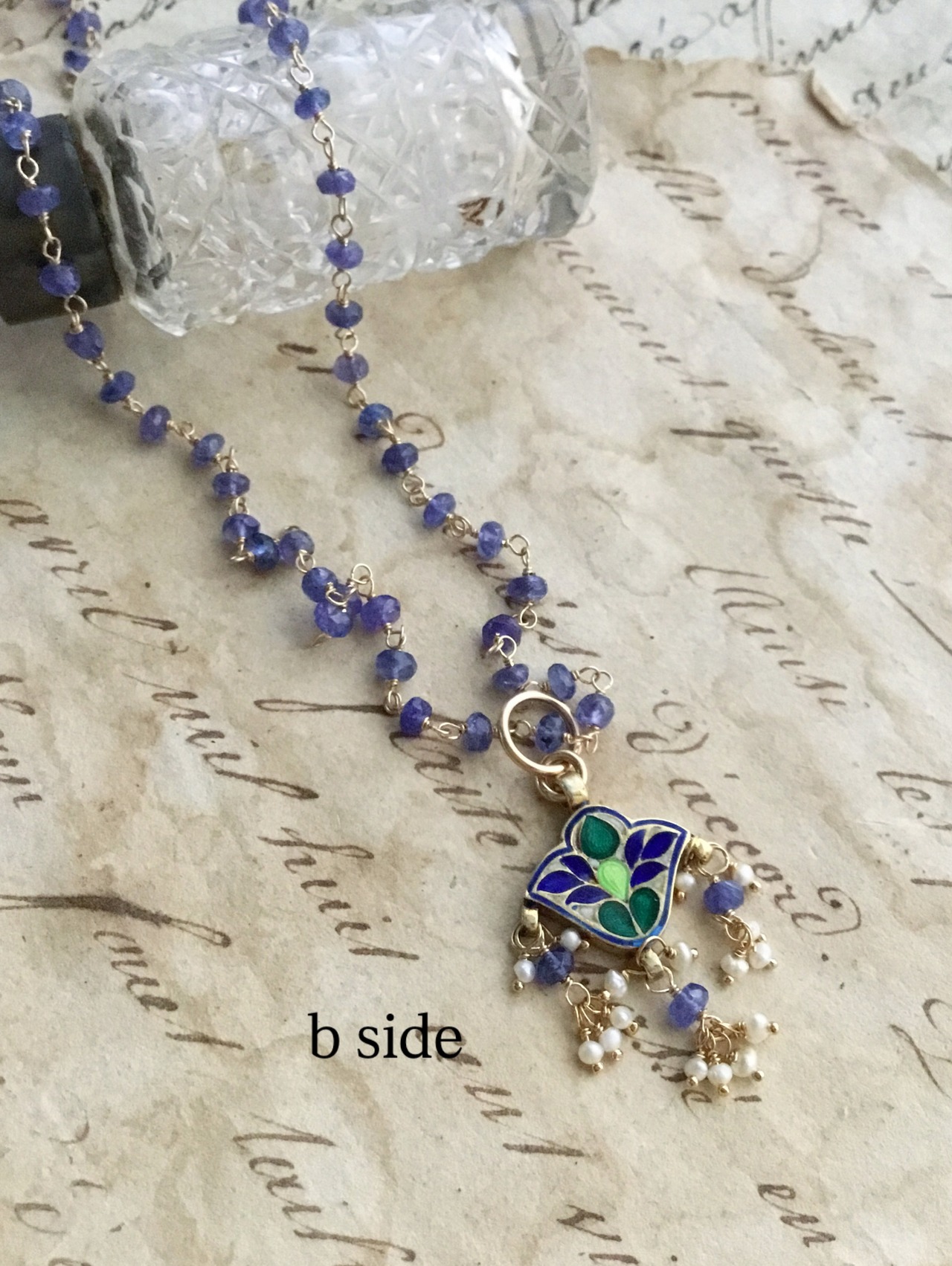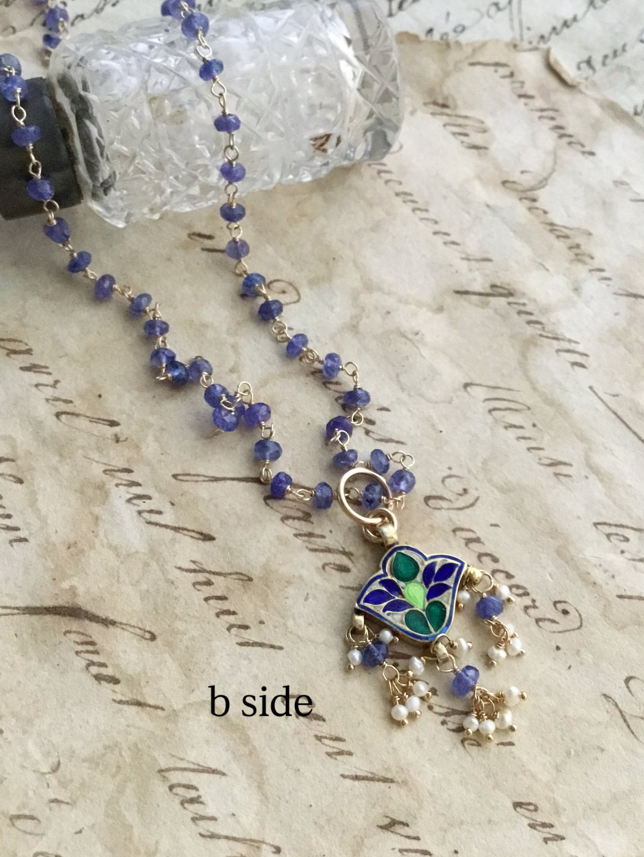 深いブルーのタンザナイトを繋いだショートネックレスと、取り外しのできる、ミーナカリのトップセットですら、