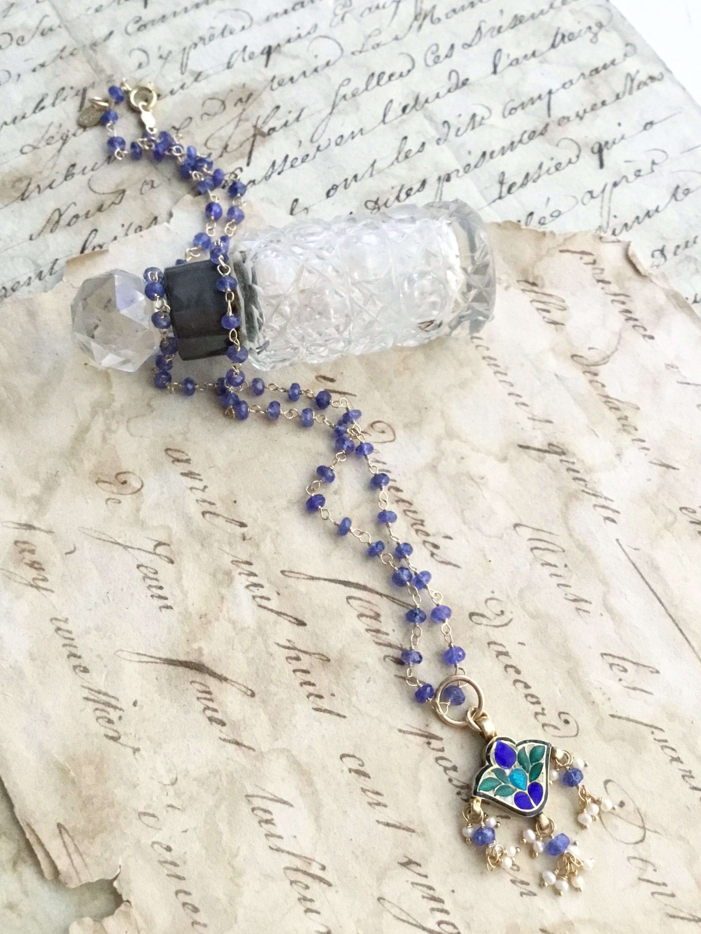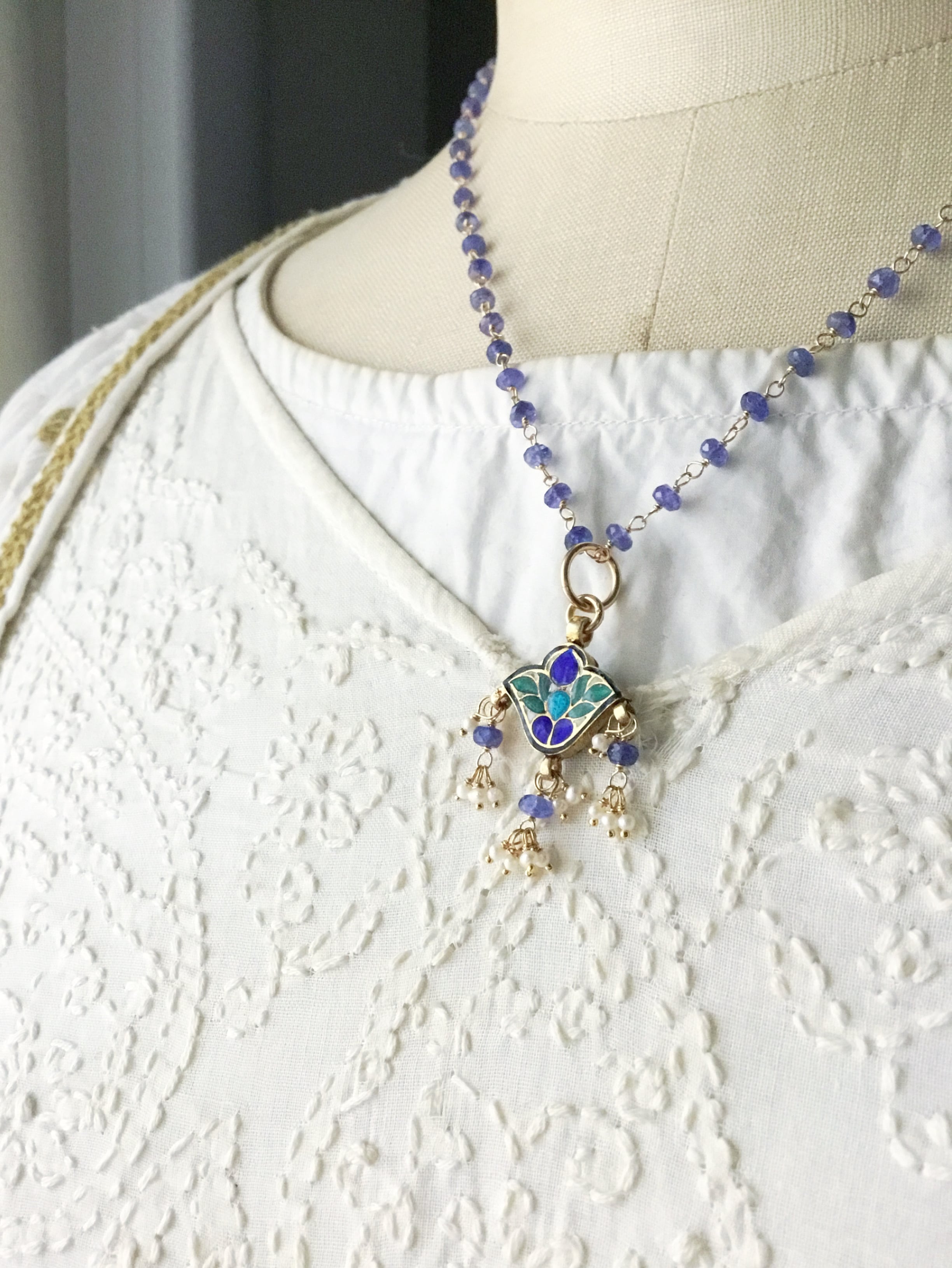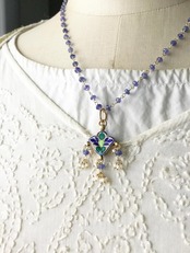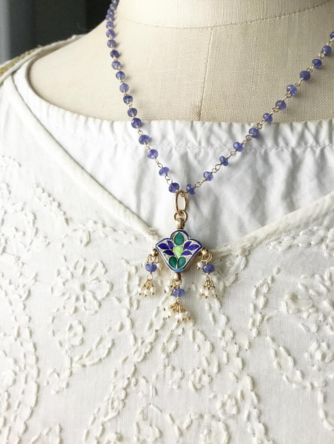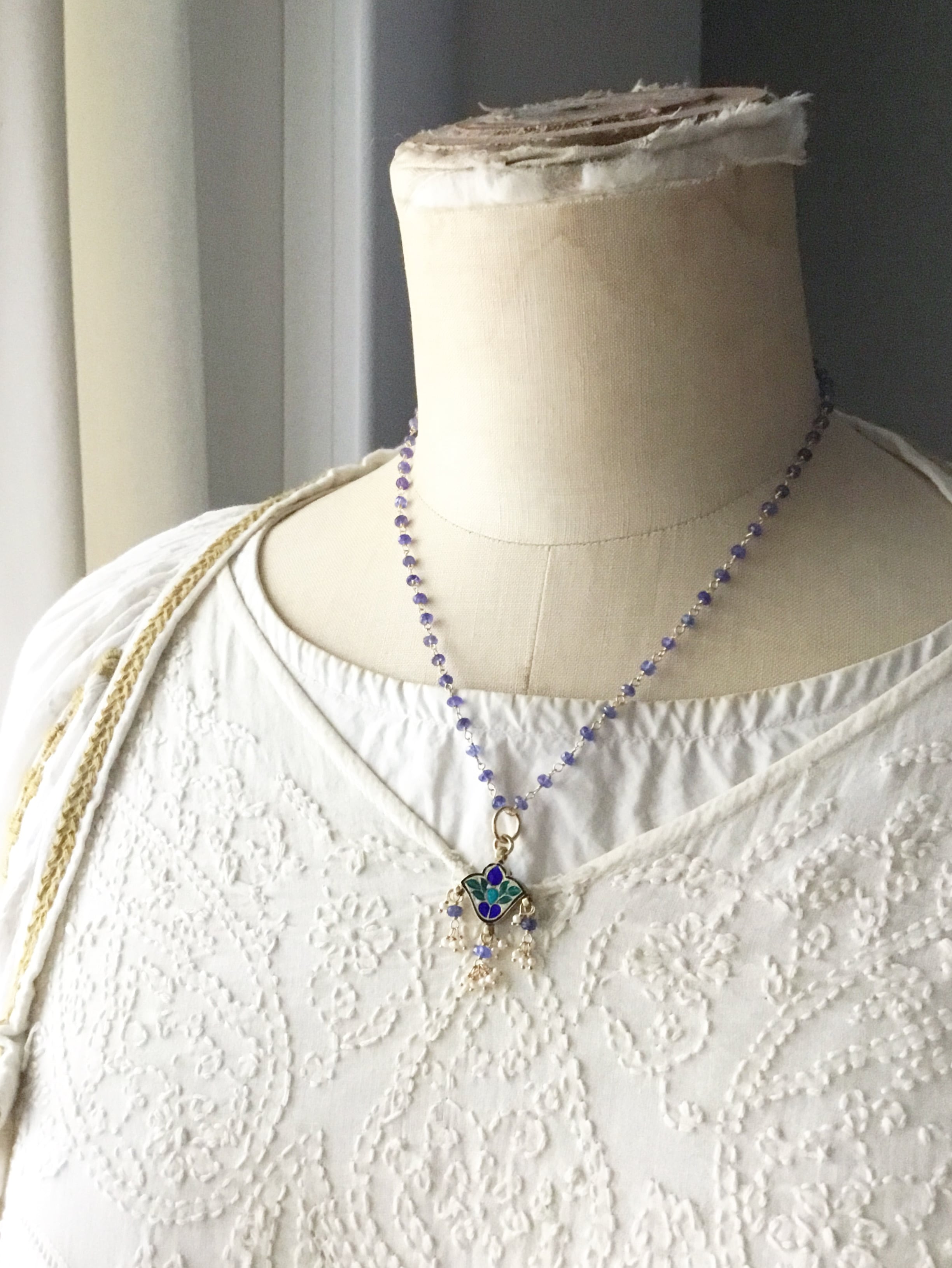 深いブルーのタンザナイトを繋いだショートネックレスと、取り外しのできる、ミーナカリのトップセットですら、