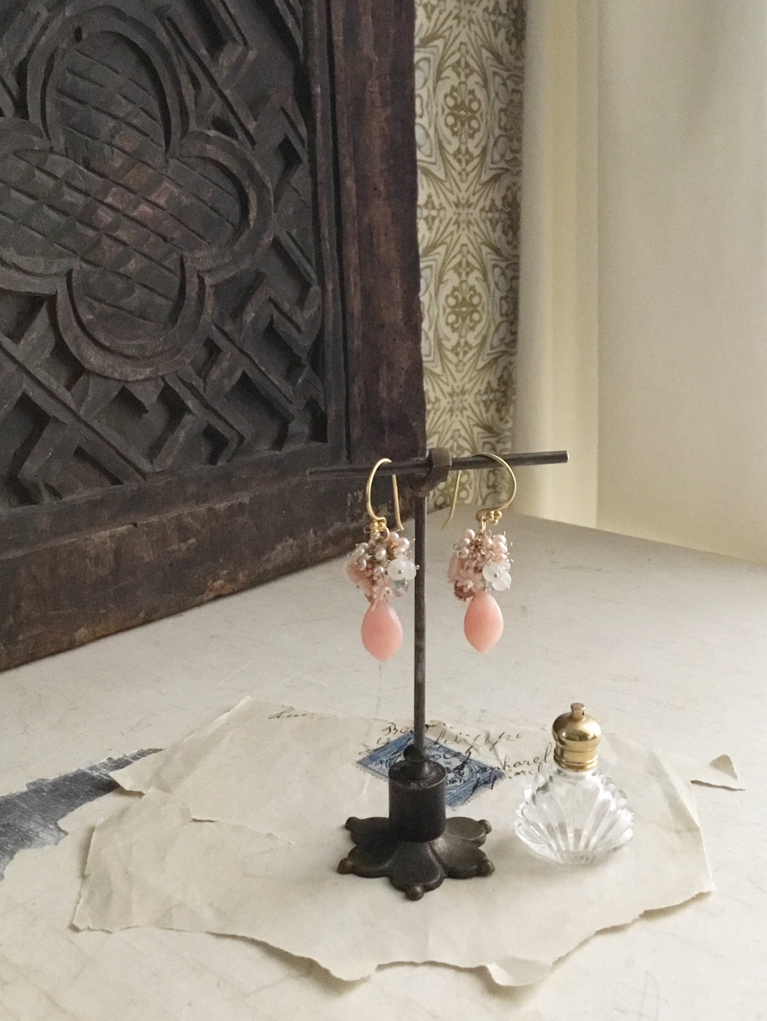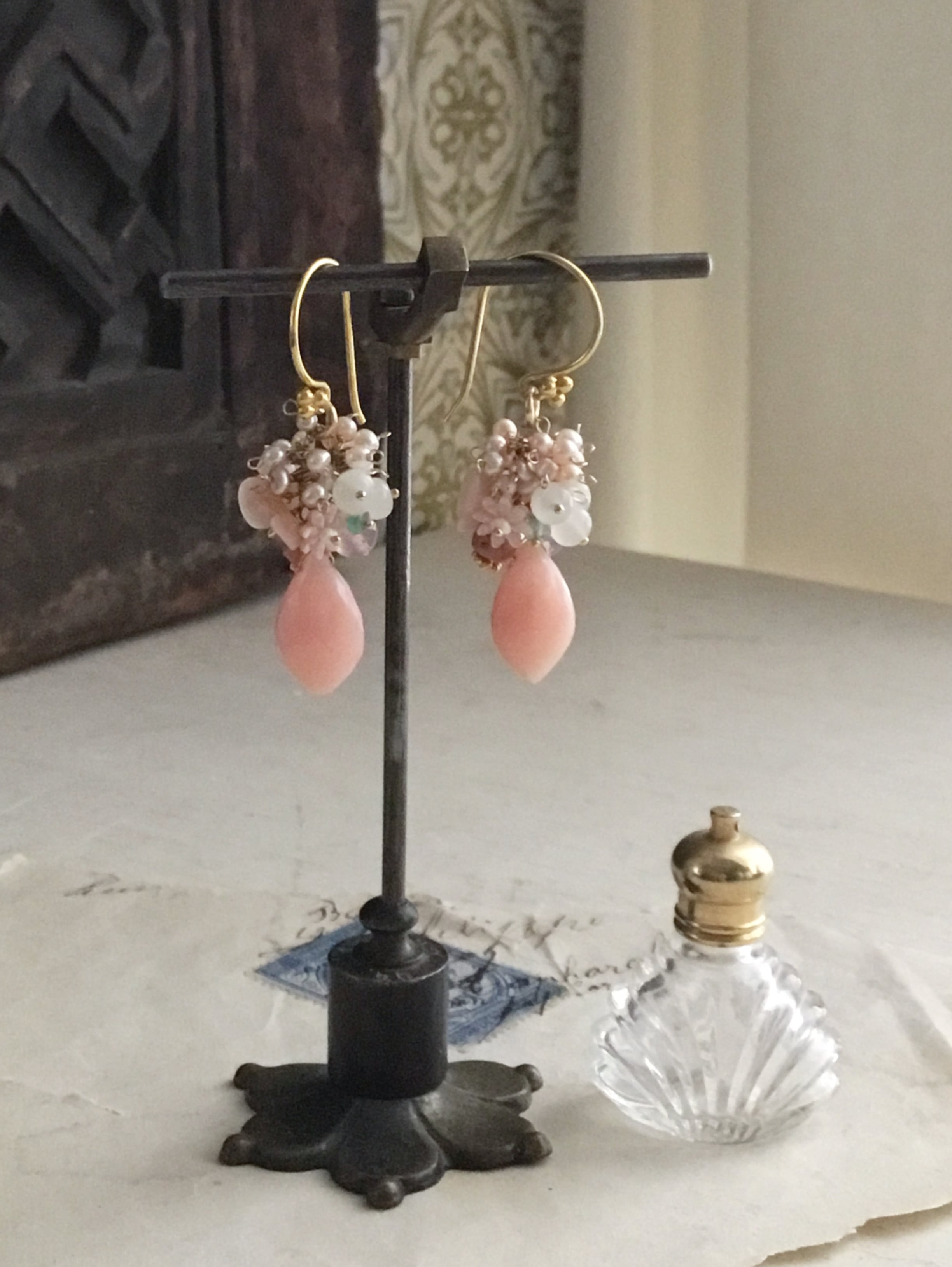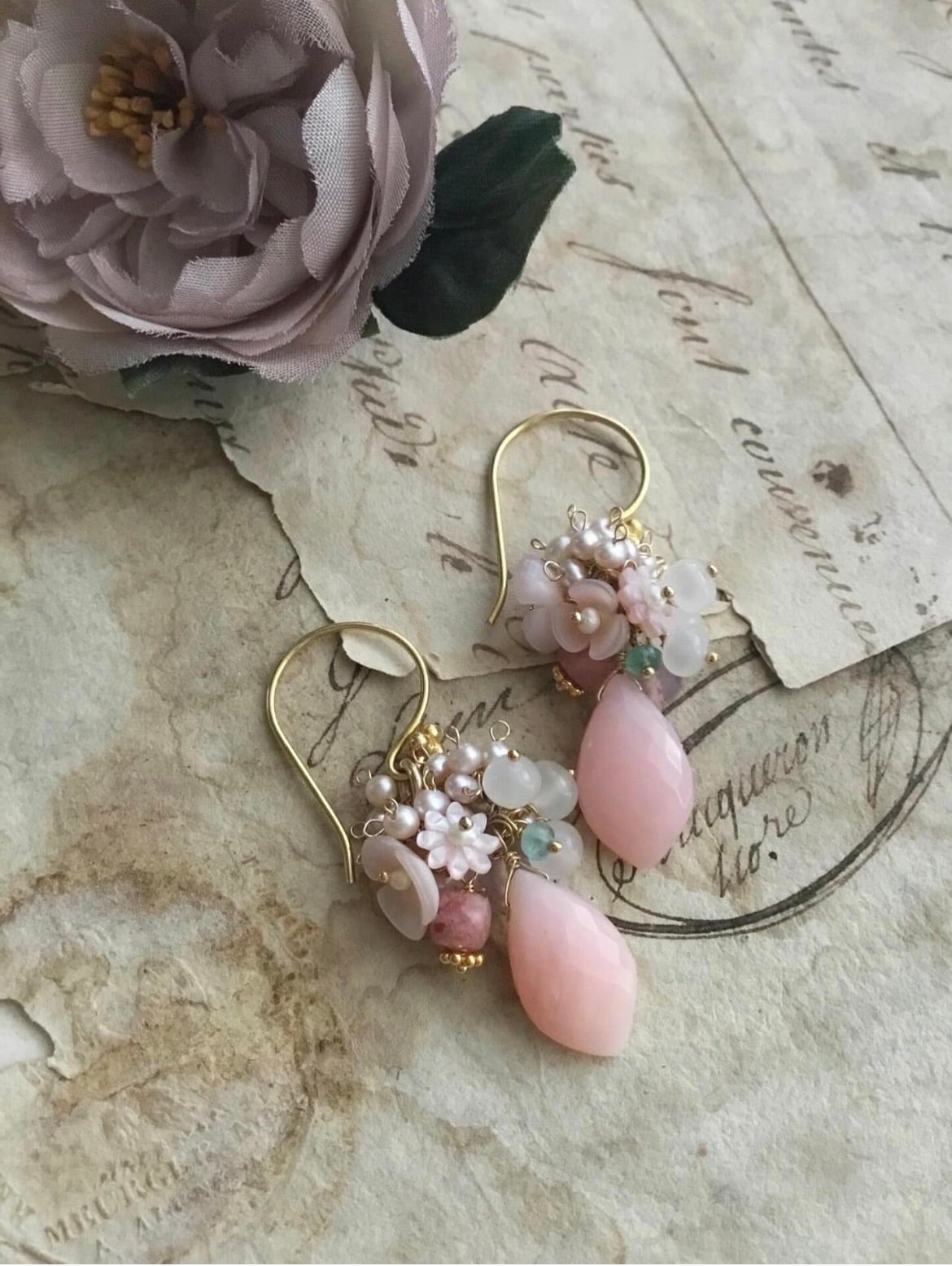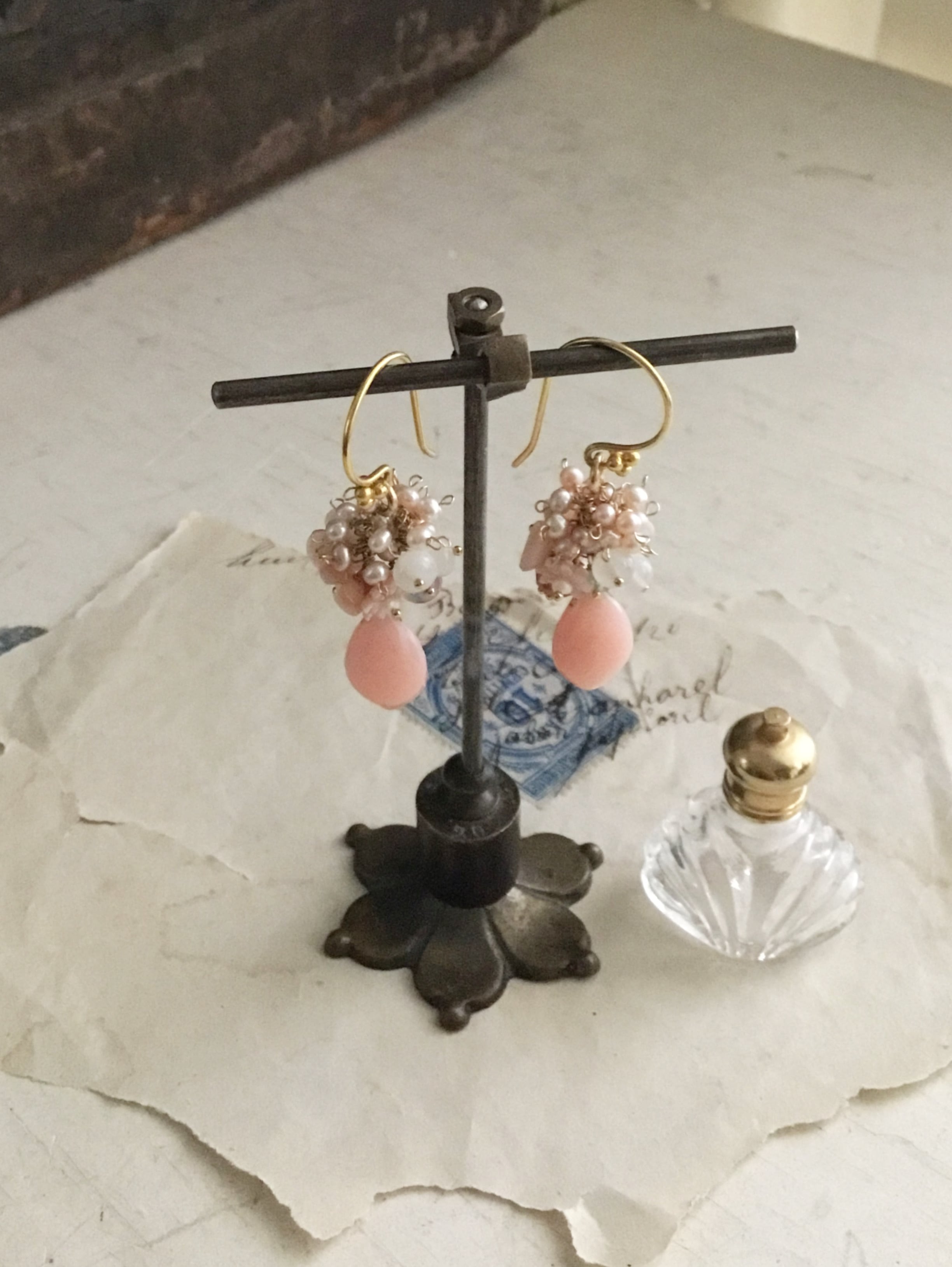 小さなパールと石、花の白蝶貝を集めたブーケのようなピアスです。