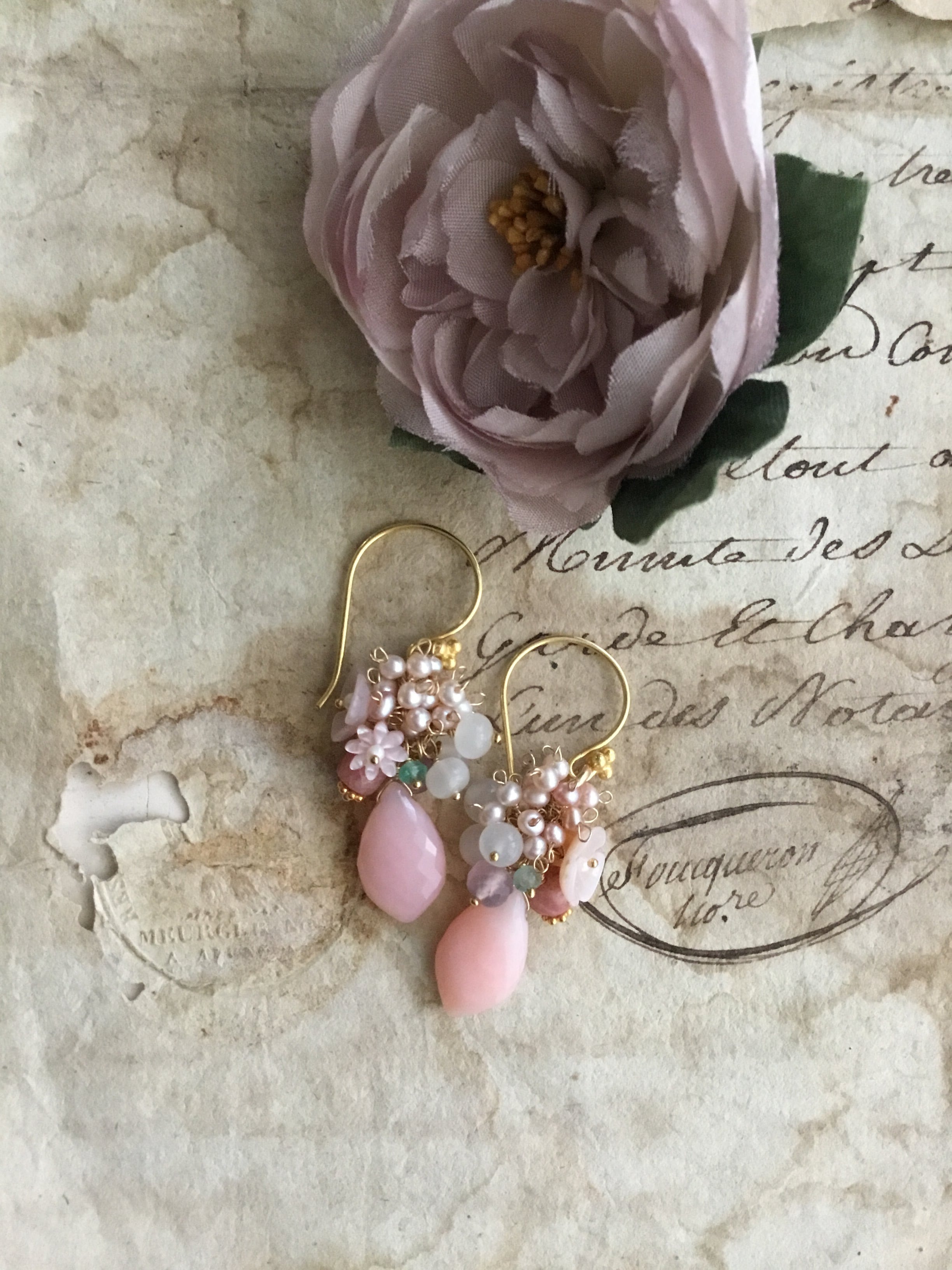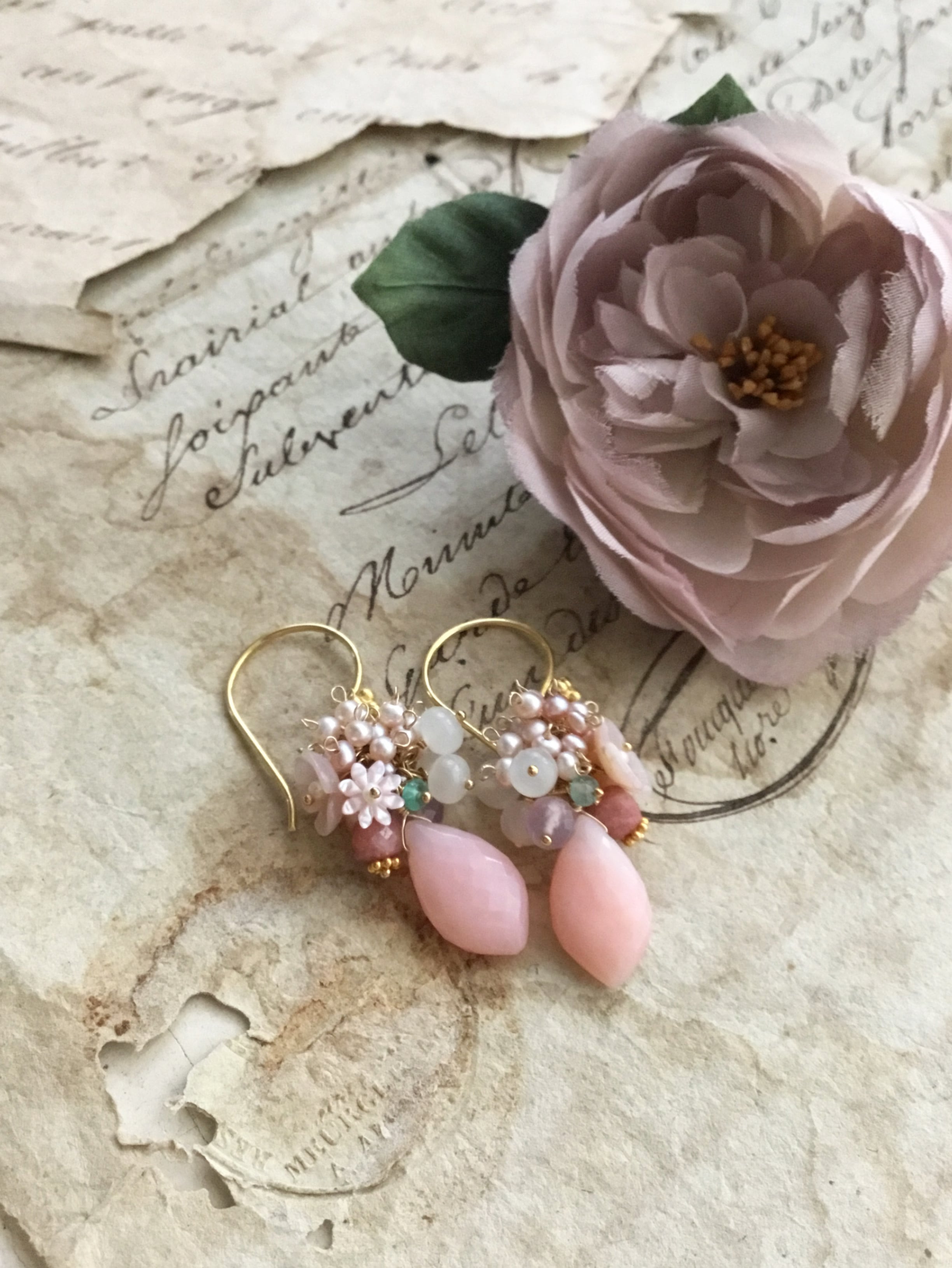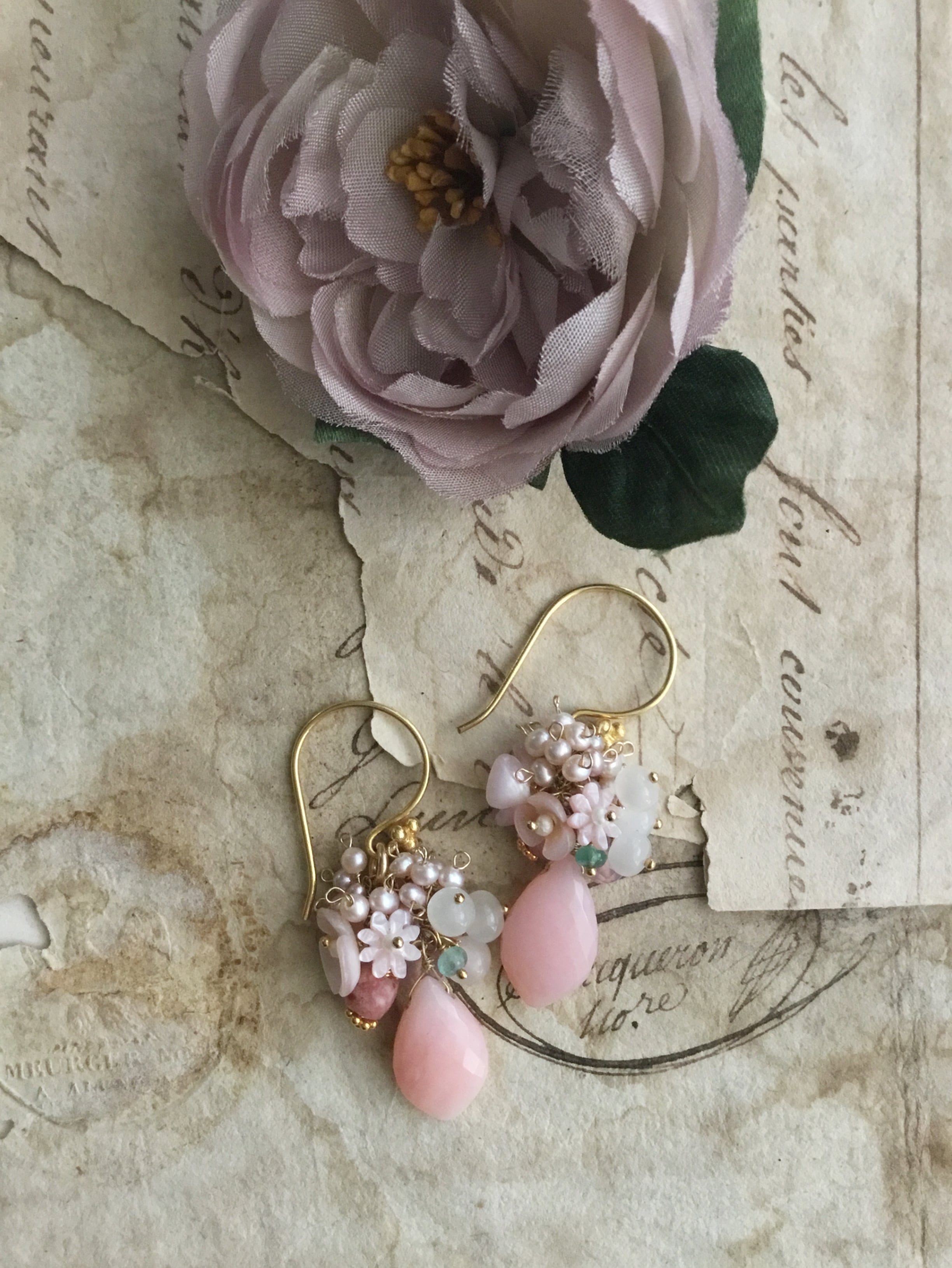 素材:ワイヤー14kgf、ピアスフック24kgp、淡水パール、ピンクオパール、ピンクカルセドニー、ロードナイト、エメラルド、ピンクシェル
