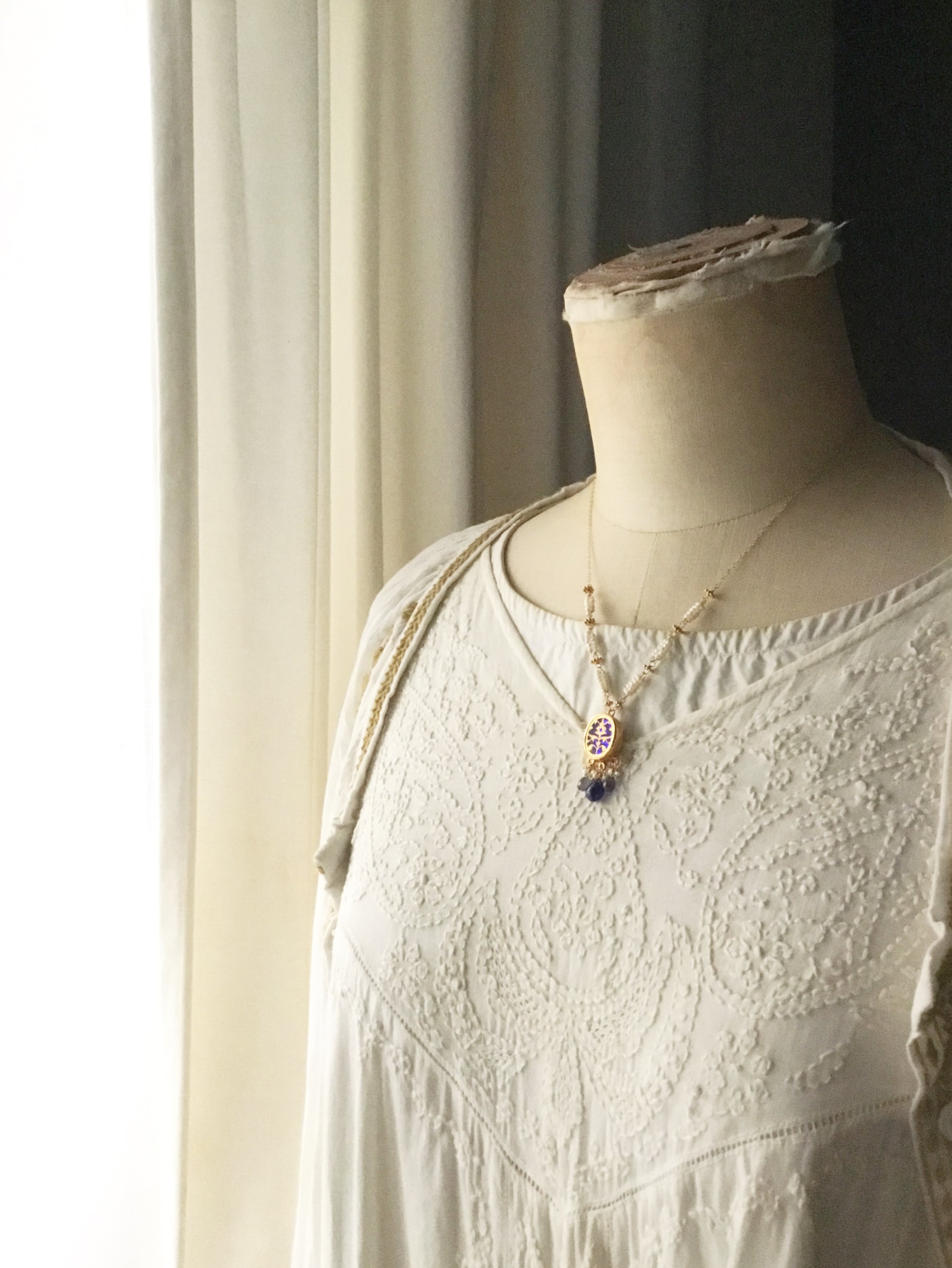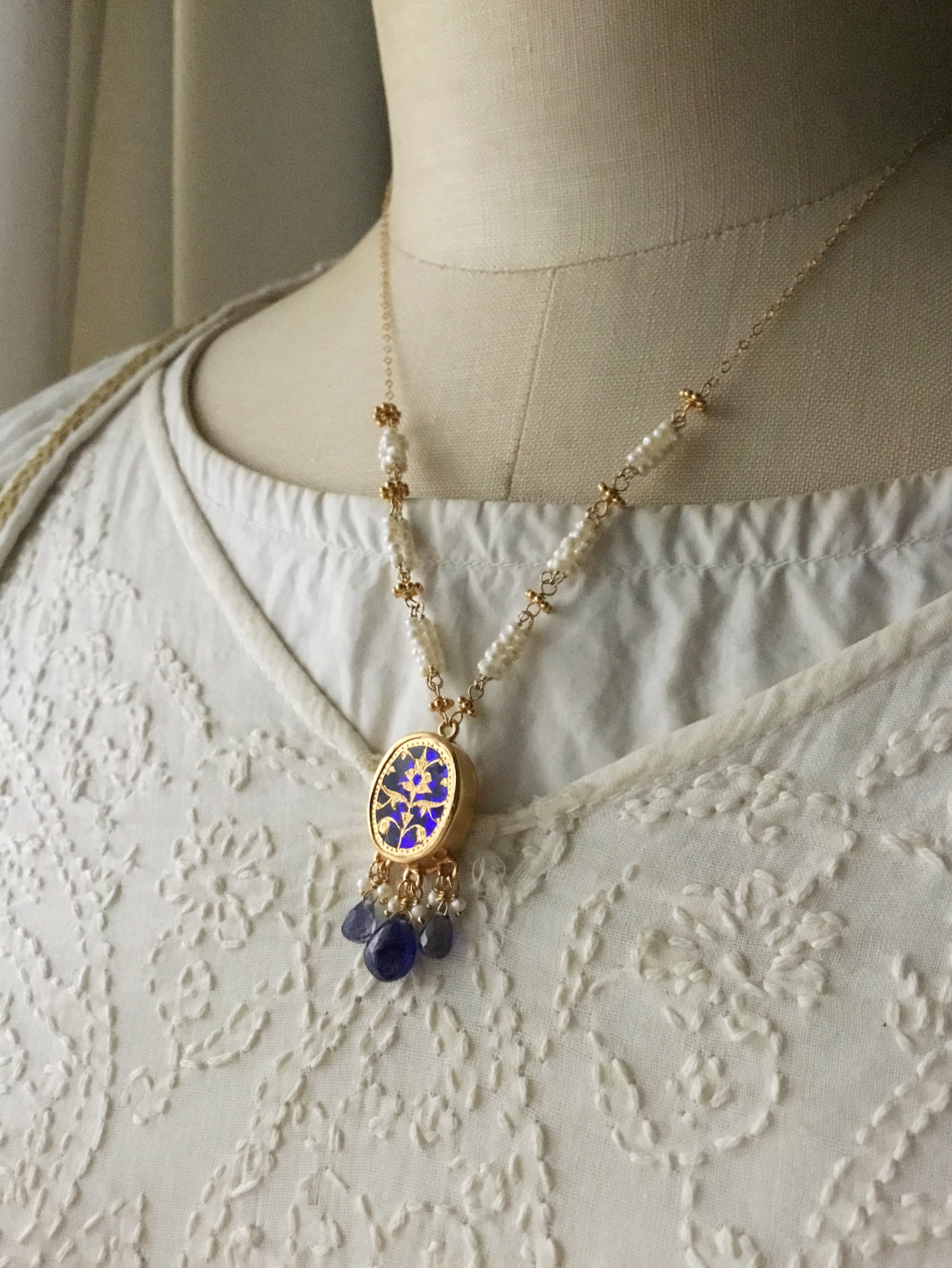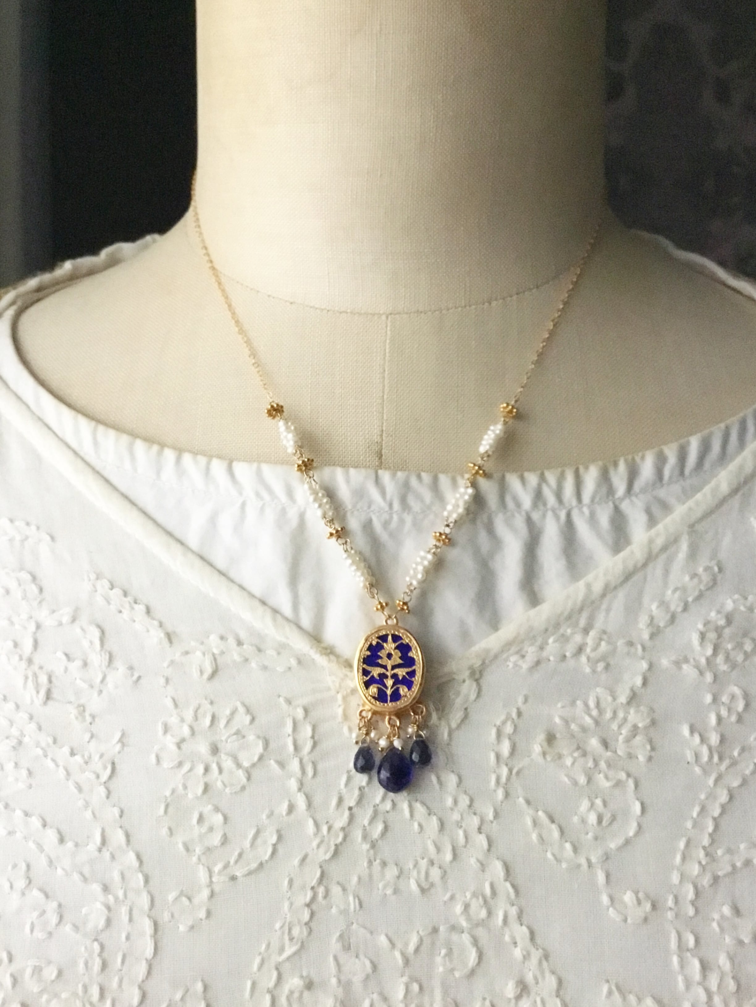 素材:チェーン、金具、ワイヤー 全て14kgf、淡水パール、ブルーサファイア、アイオライト、テワ
