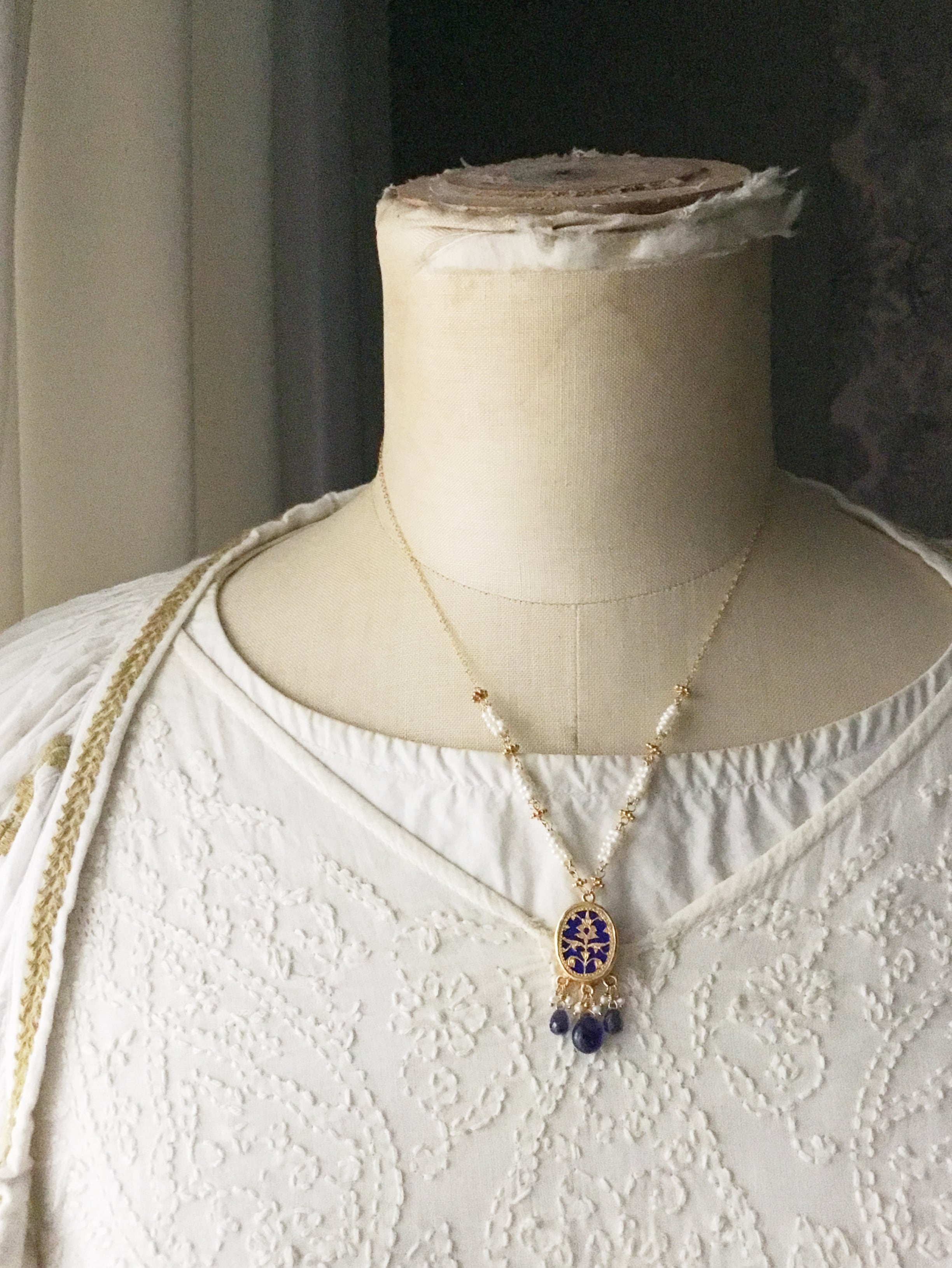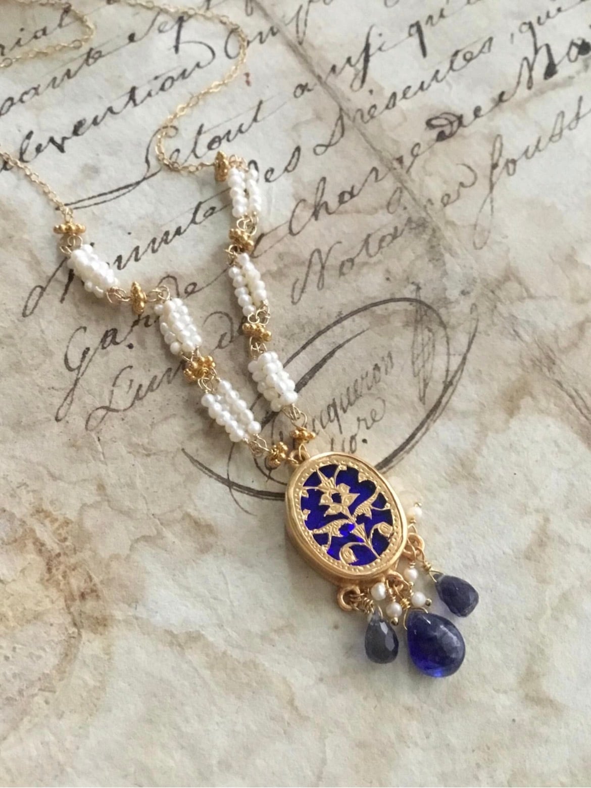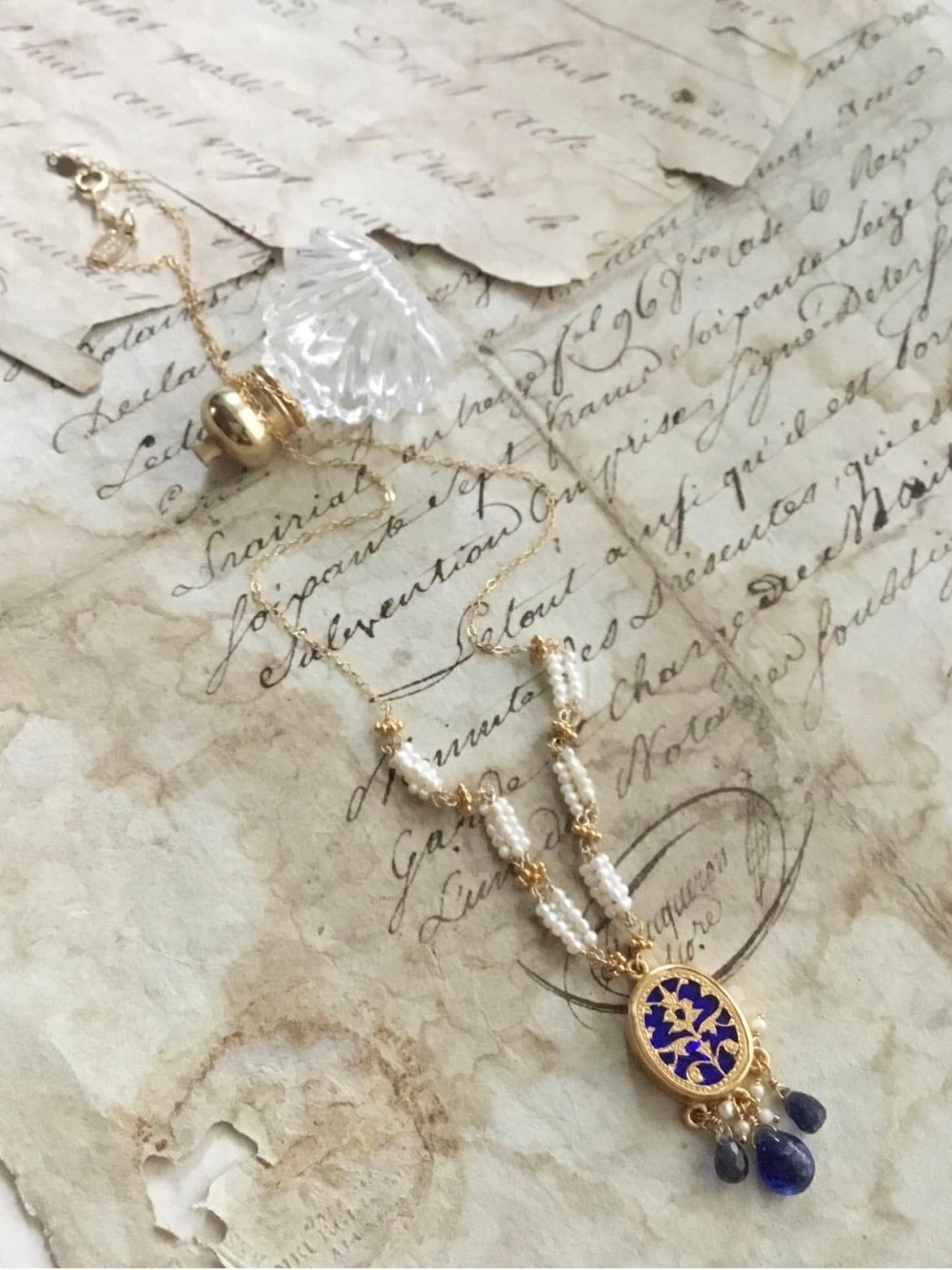 素材:チェーン、金具、ワイヤー 全て14kgf、淡水パール、ブルーサファイア、アイオライト、テワ