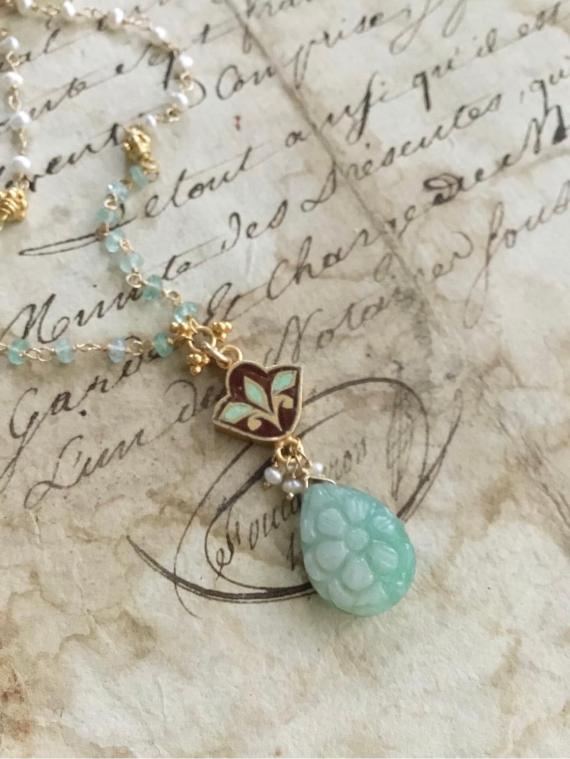 チョコレートミントの様なカラーのミーナカリと、美しいエメラルドのカービングを合わせています。ミーナは両面共に、デザイン、色が異なります。