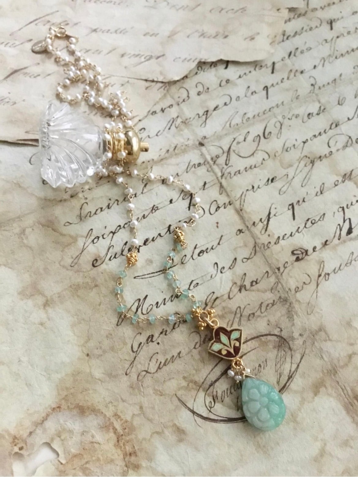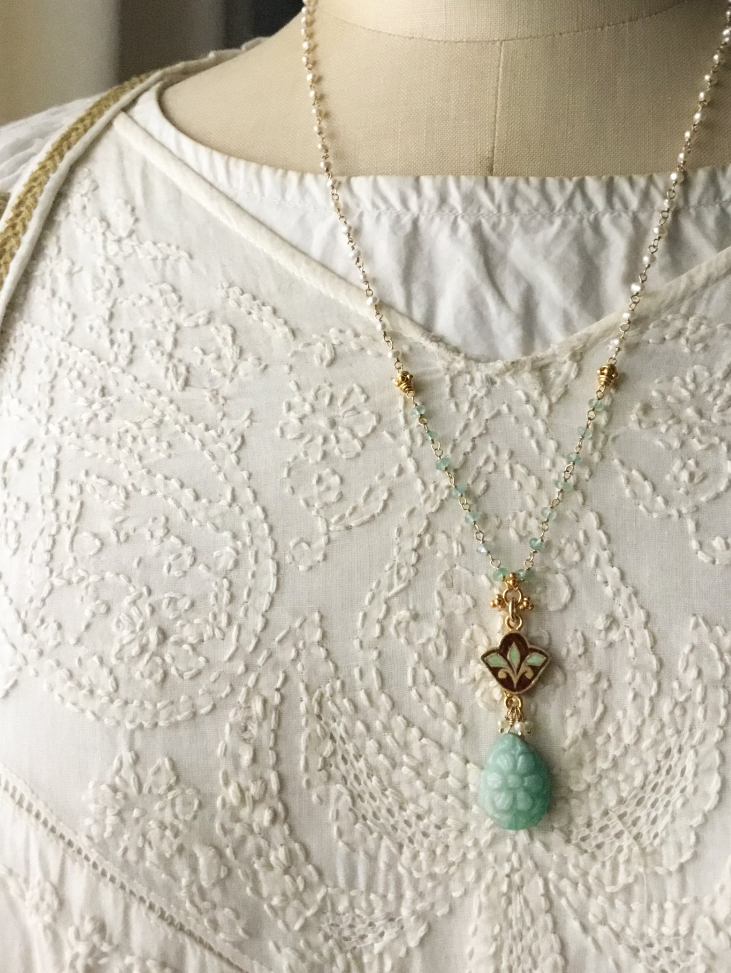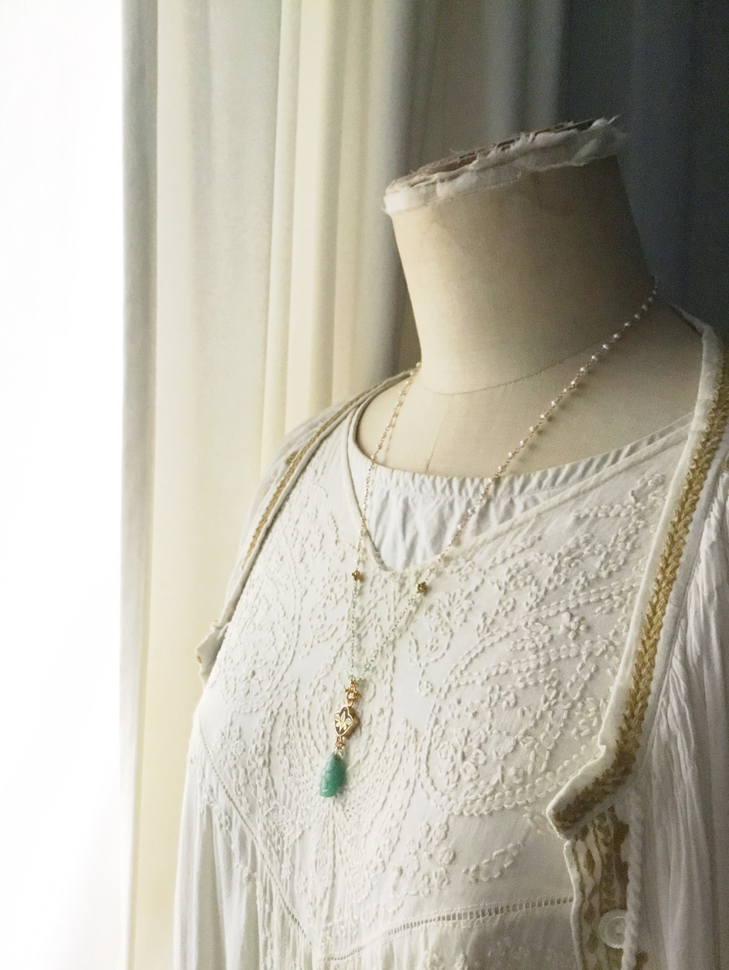 素材:チェーン、金具、ワイヤー 全て14kgf、エメラルド、淡水パール、ミーナカリ