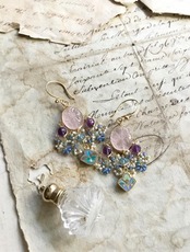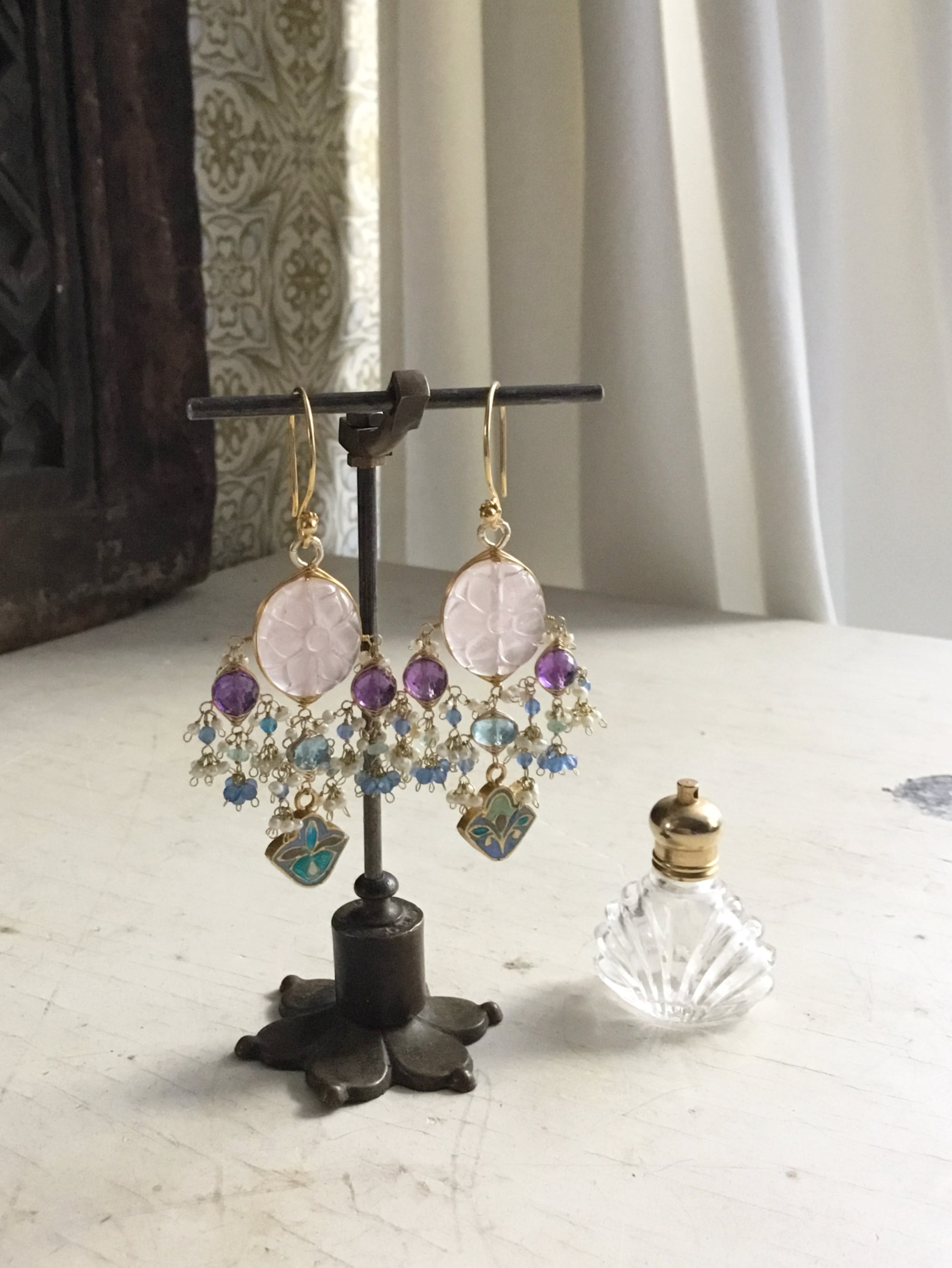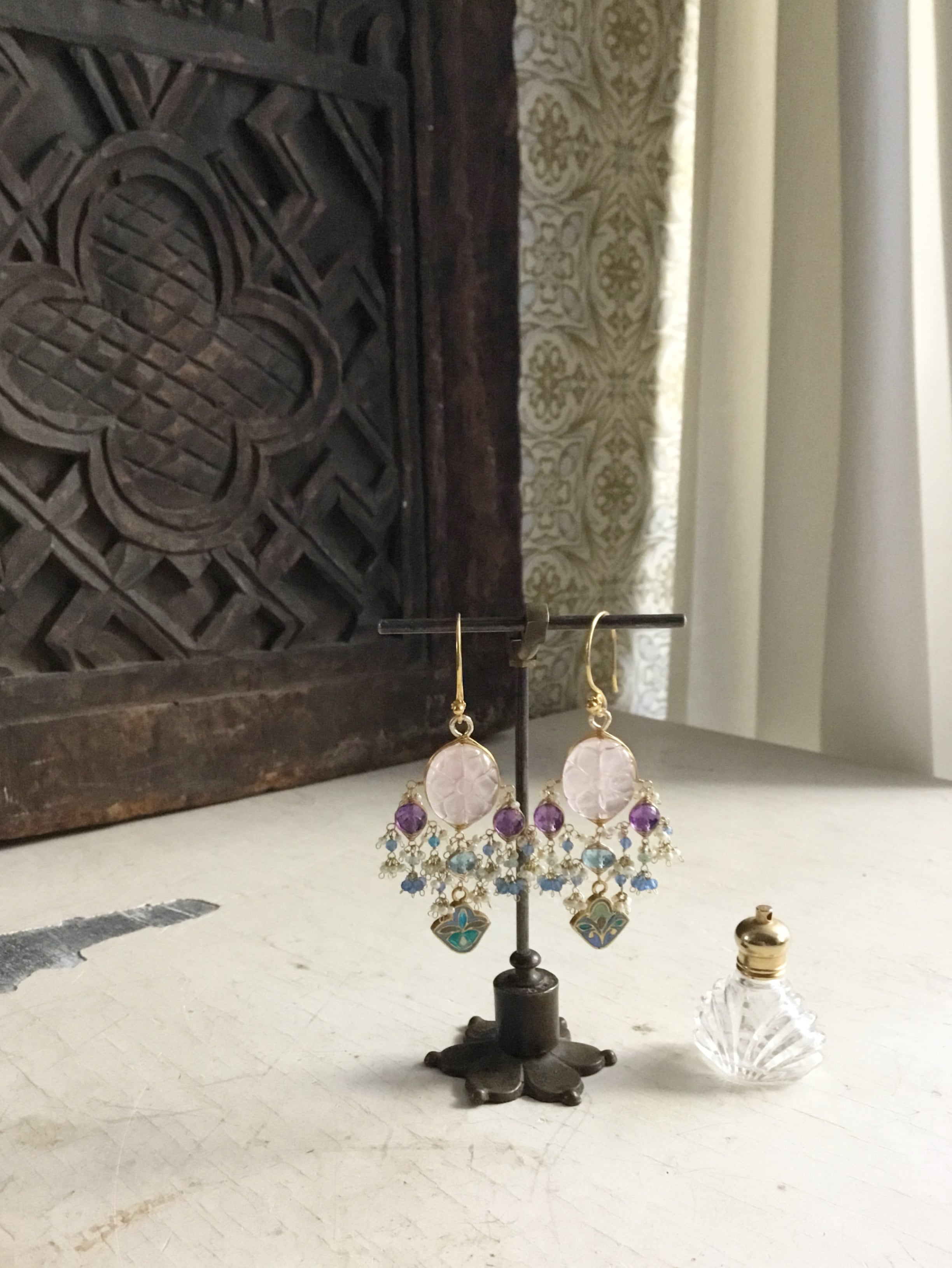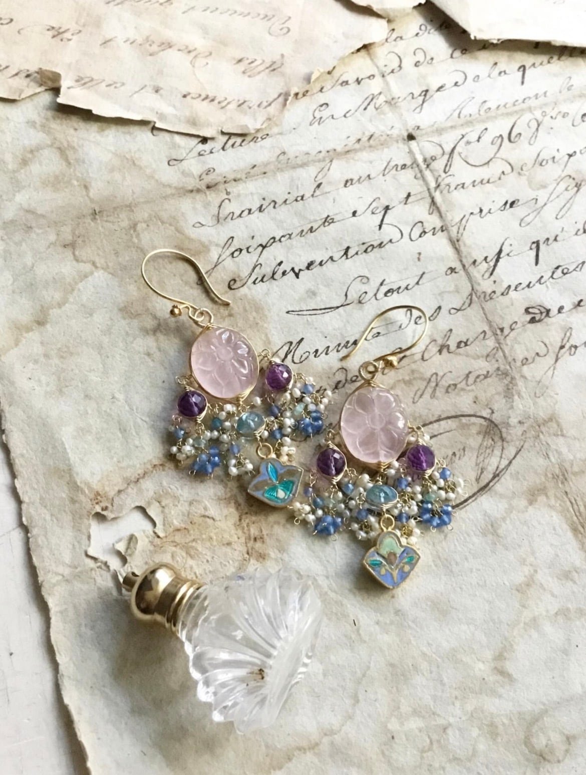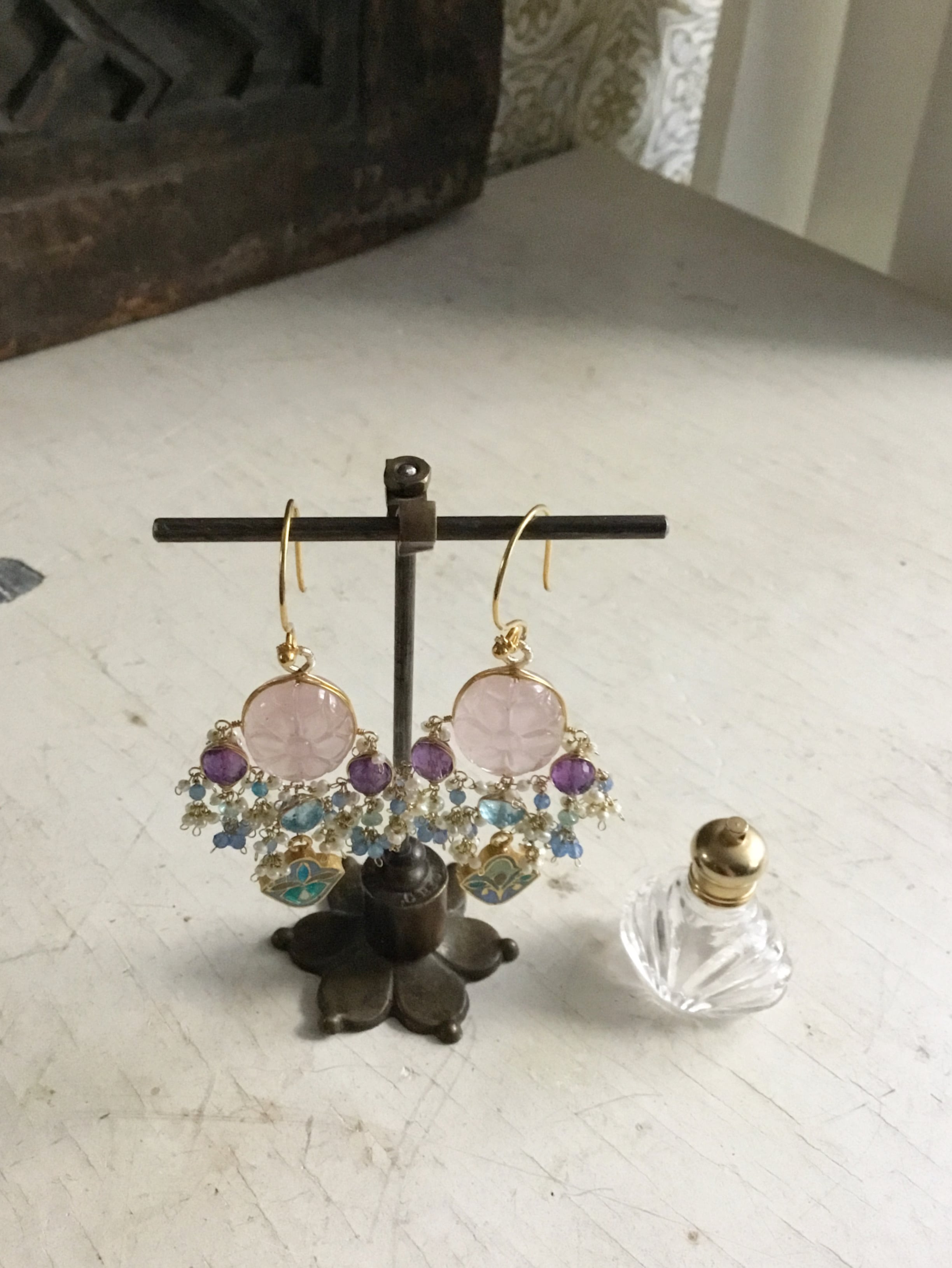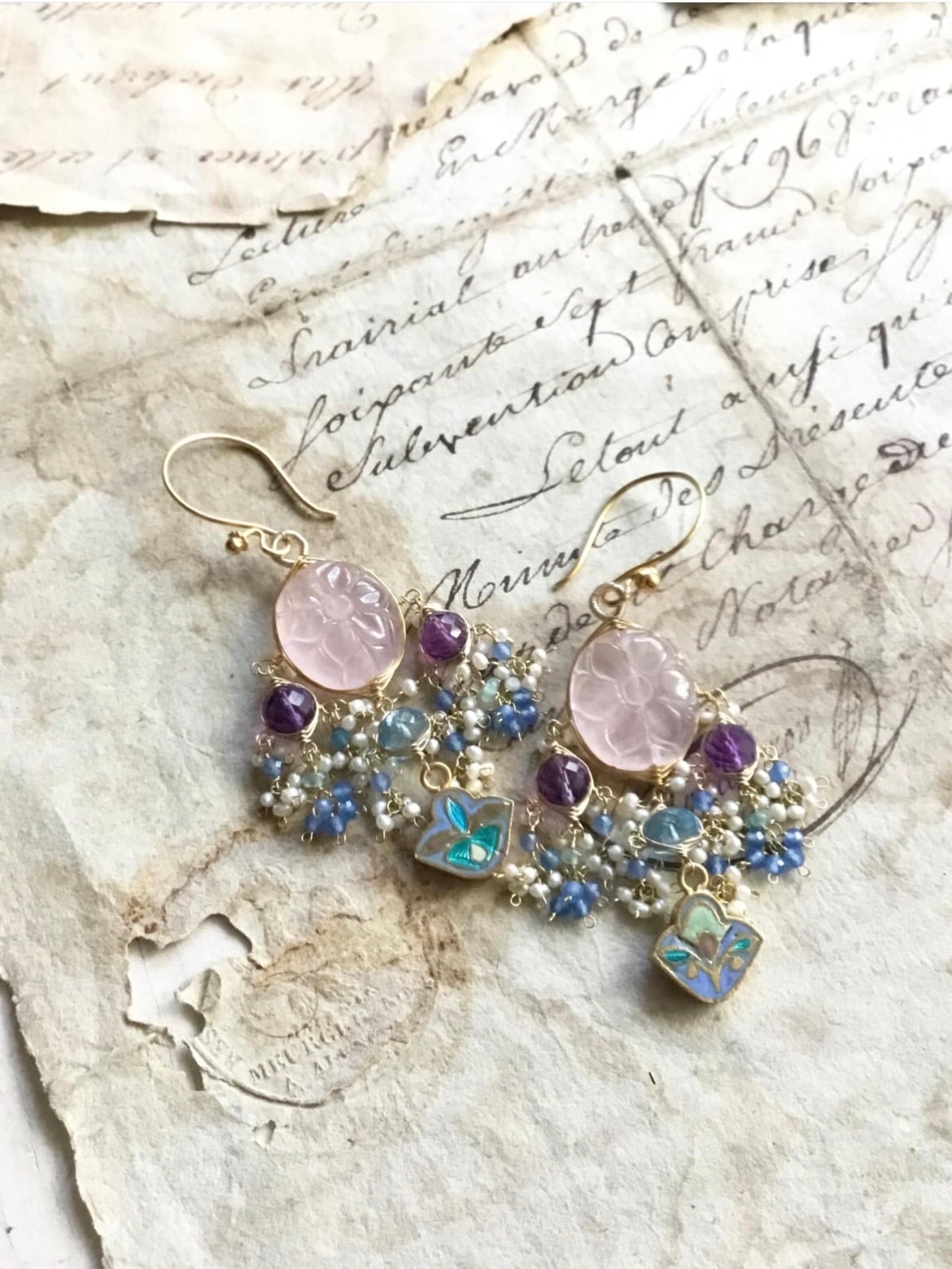 両面とても美しいクダイとカラーのミーナカリで、ブルーアゲートからアメジスト、淡いローズクォーツの色合いが綺麗なピアスです。