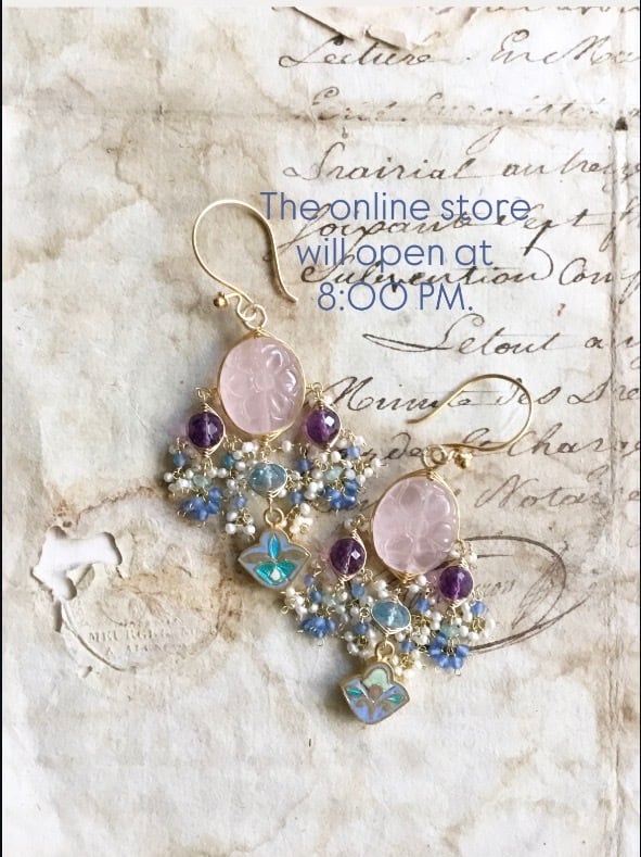 素材:ワイヤー14kgf、ピアスフック24kgp、淡水パール、ローズクォーツ、アメジスト、サンタマリアいアクアマリン、ブルーアゲート、エメラルド、ミーナカリ