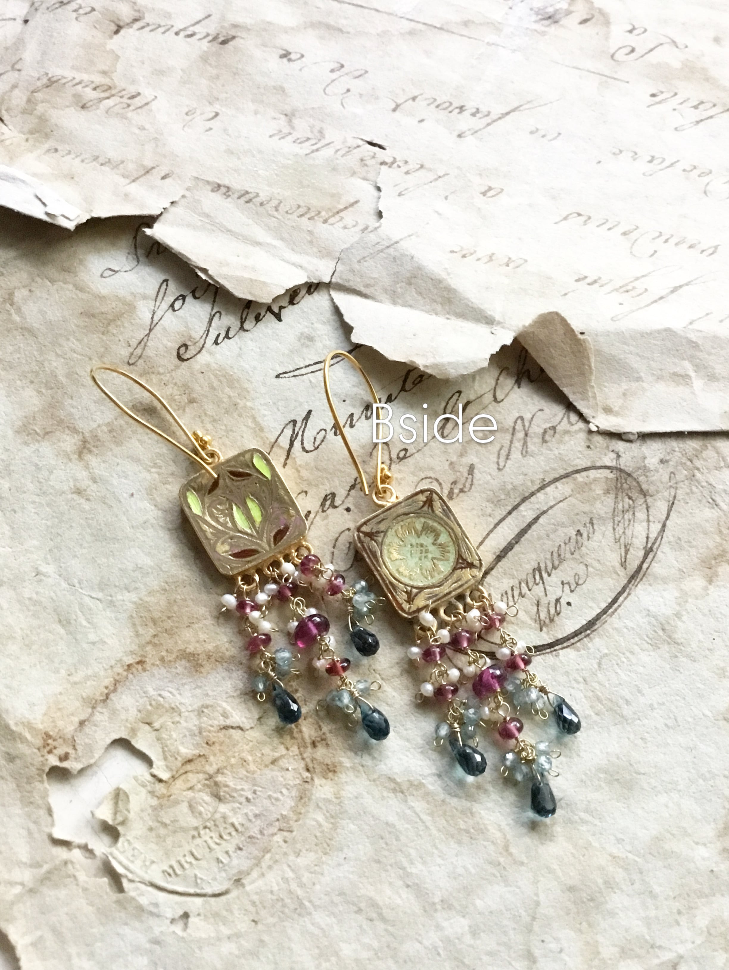 素材:ワイヤー14kgf、ピアスフック22kgp、淡水パール、ロンドンブルートパーズ、ロードライトガーネット、ブルージルコン、ミーナカリ
